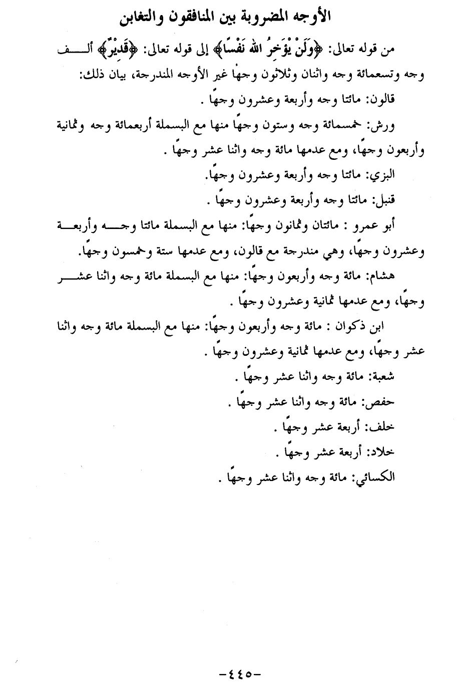من قوله تعالى: وَلَنْ يُؤَخِّرَ اللَّهُ نَفْساً إلى قوله تعالى: قَدِيرٌ ألف وجه وتسعمائة وجه واثنان وثلاثون وجها غير الأوجه المندرجة، بيان ذلك: