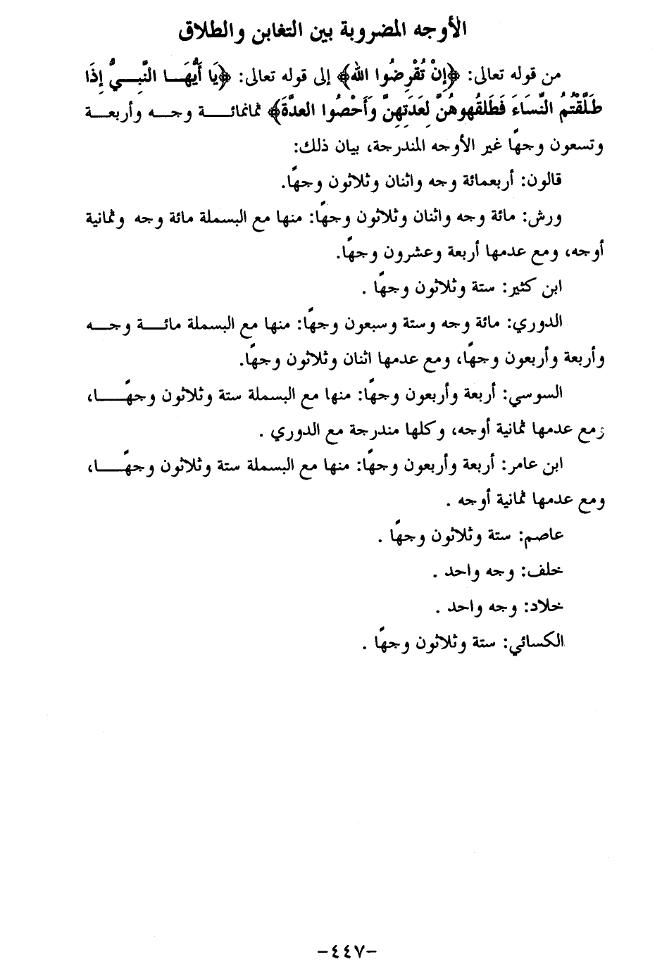 من قوله تعالى: إِنْ تُقْرِضُوا اللَّهَ إلى قوله تعالى: يا أَيُّهَا النَّبِيُّ إِذا طَلَّقْتُمُ النِّساءَ فَطَلِّقُوهُنَّ لِعِدَّتِهِنَّ وَأَحْصُوا الْعِدَّةَ ثمانمائة وجه وأربعة وتسعون وجها غير الأوجه المندرجة، بيان ذلك: