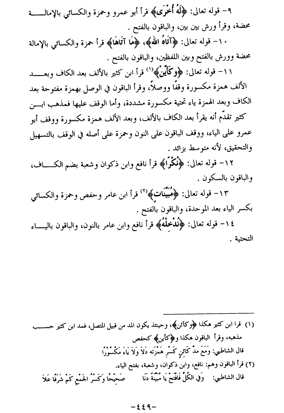 (¬1) قرأ ابن كثير هكذا (وكائن)، وحينئذ يكون المد من قبيل المتصل، فمد ابن كثير حسب مذهبه، وقرأ الباقون هكذا وكَأَيِّنْ كحفص قال الشاطبي: ومع مد كائن كسر همزته دلا ولا ياء مكسورا