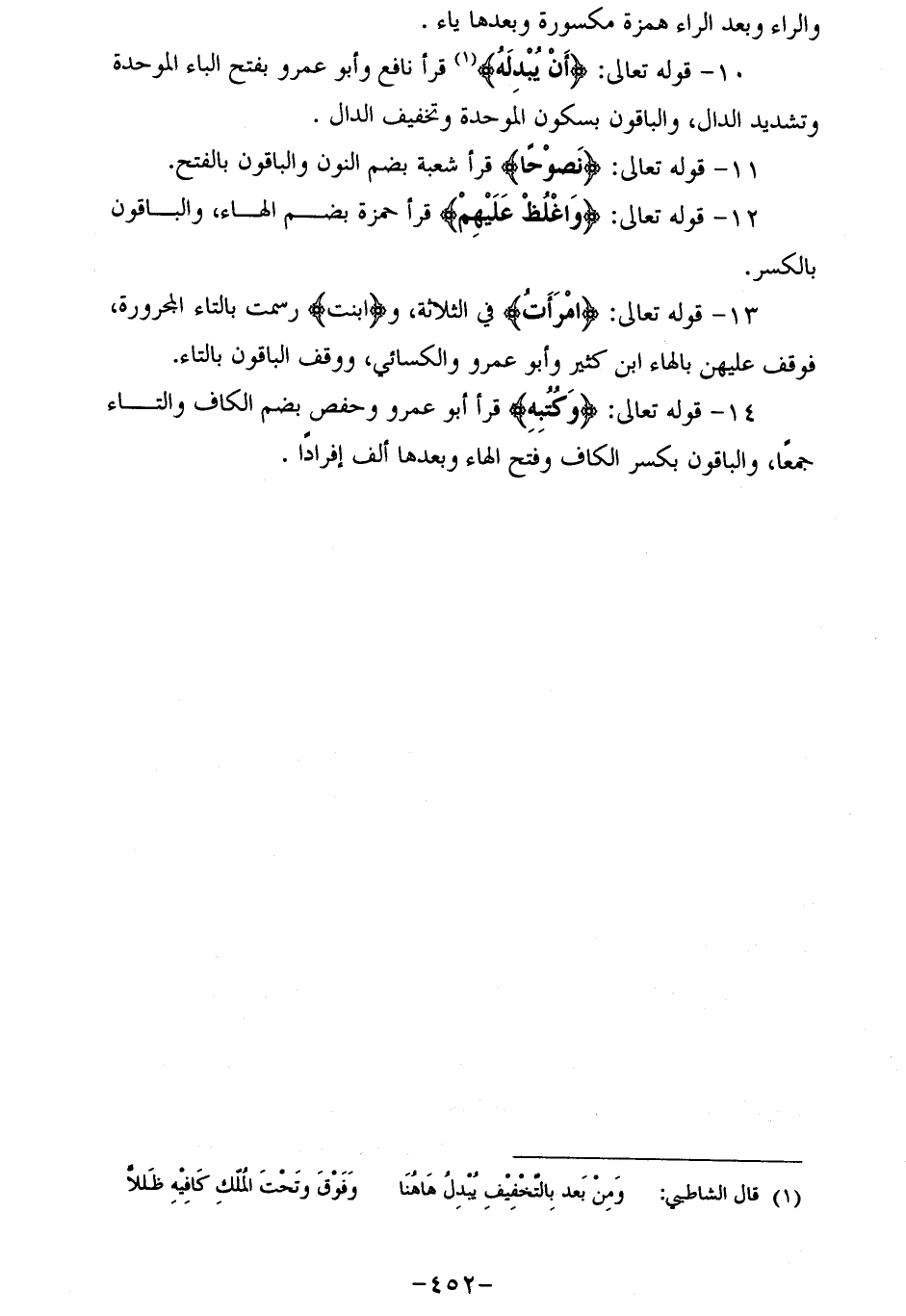 13 - قوله تعالى: امْرَأَتَ في الثلاثة، وابْنَتَ رسمت بالتاء المجرورة، فوقف عليهن بالهاء ابن كثير وأبو عمرو والكسائي، ووقف الباقون بالتاء.