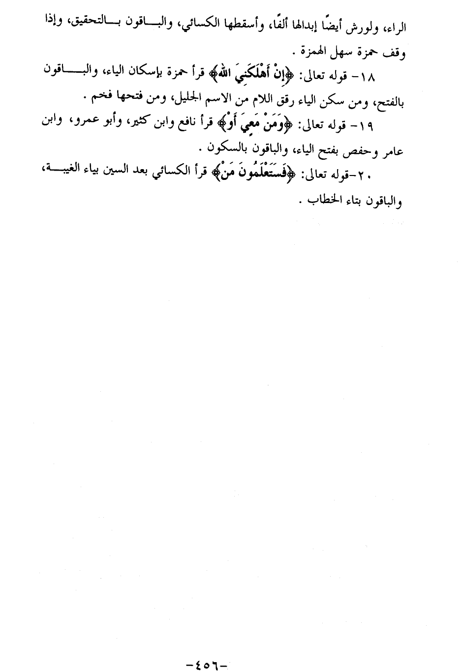 18 - قوله تعالى: إِنْ أَهْلَكَنِيَ اللَّهُ قرأ حمزة بإسكان الياء، والباقون بالفتح، ومن سكن الياء رقق اللام من الاسم الجليل، ومن فتحها فخم.