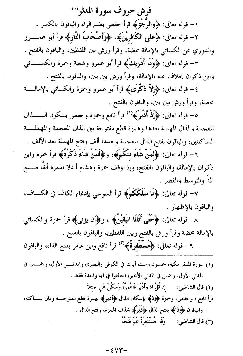 (¬2) قال الشاطبي: إذ قل اذ وأدبر فاهمزه وسكّن عن اجتلا قرأ نافع، وحفص، وحمزة (إذ) بإسكان الذال (أدبر) بهمزة قطع مفتوحة ودال ساكنة، والباقون (إذا) بفتح الذال (دبر) بحذف الهمزة، وفتح الدال.