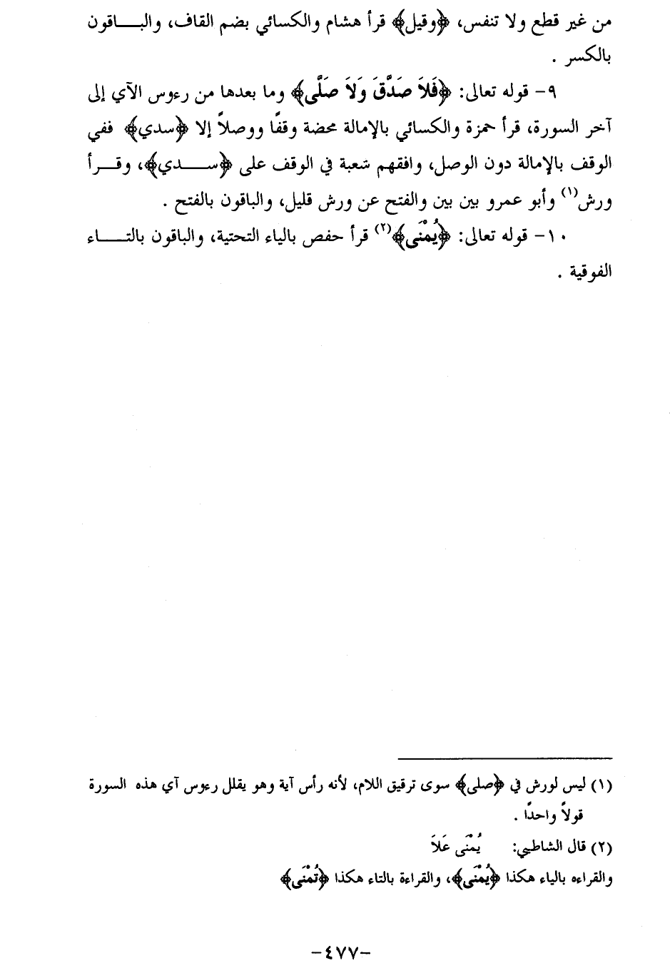 9 - قوله تعالى: فَلا صَدَّقَ وَلا صَلَّى وما بعدها من رءوس الآي إلى آخر السورة، قرأ حمزة والكسائي بالإمالة محضة وقفا ووصلا إلا سُدىً ففي الوقف بالإمالة دون الوصل، وافقهم شعبة في الوقف على سُدىً، وقرأ ورش (¬1) وأبو عمرو بين بين والفتح عن ورش قليل، والباقون بالفتح.
