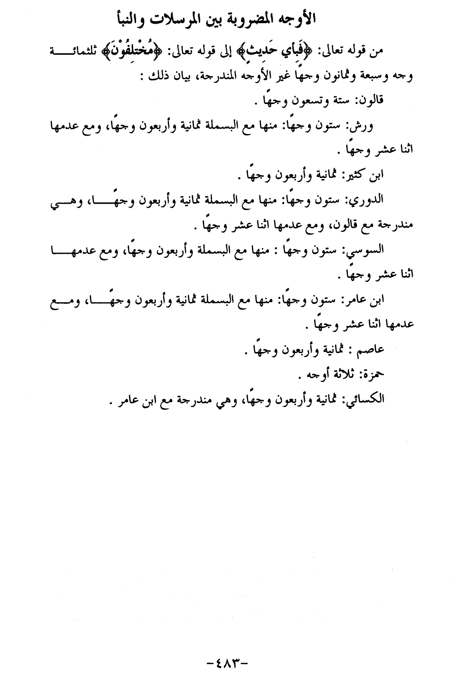 من قوله تعالى: فَبِأَيِّ حَدِيثٍ إلى قوله تعالى: مُخْتَلِفُونَ ثلاثمائة وجه وسبعة وثمانون وجها غير الأوجه المندرجة، بيان ذلك: