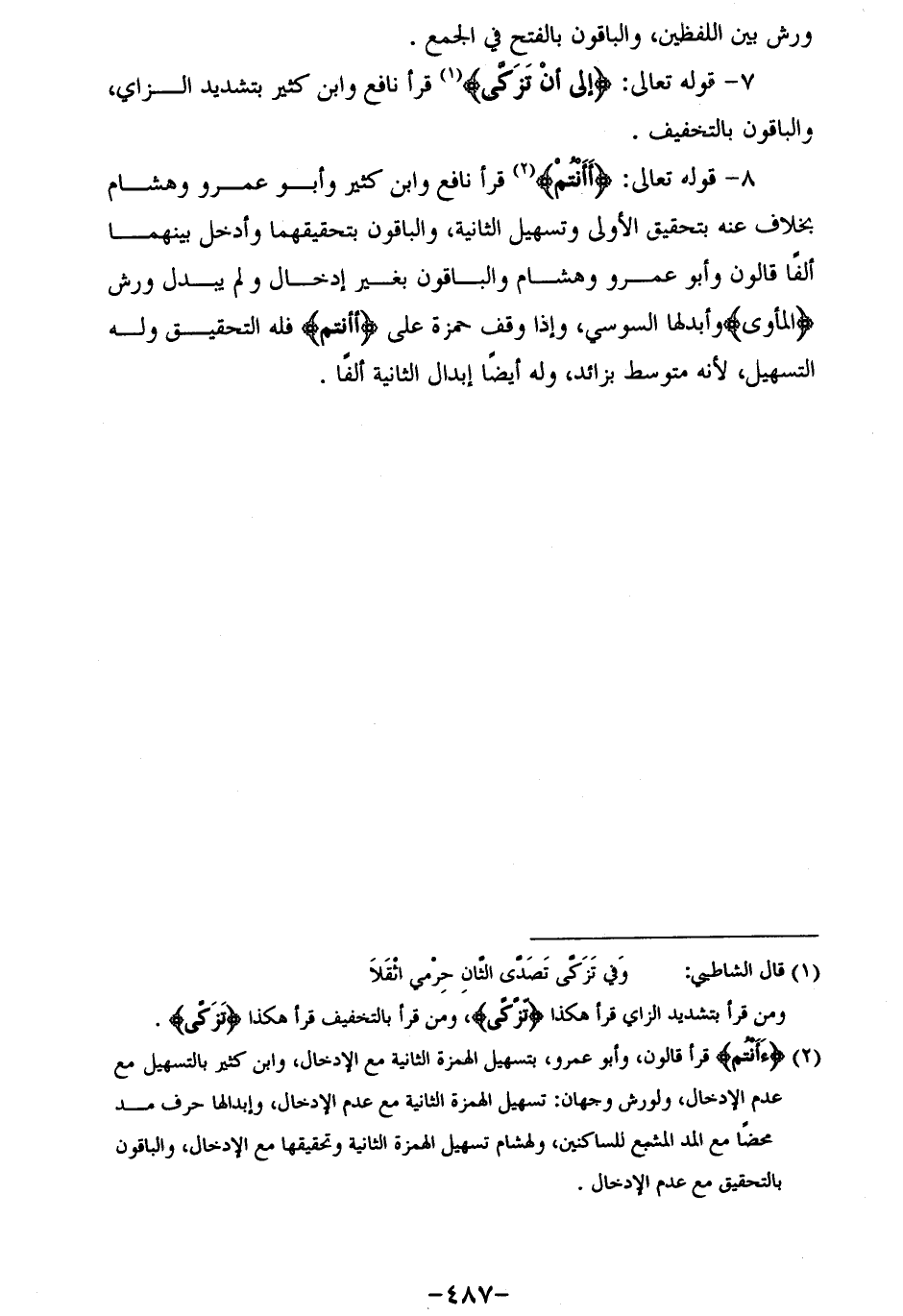 (¬1) قال الشاطبي: وفي تزكّى تصدّى الثّان حرمي اثقلا ومن قرأ بتشديد الزاي قرأ هكذا (تزكى)، ومن قرأ بالتخفيف قرأ هكذا (تزكى).