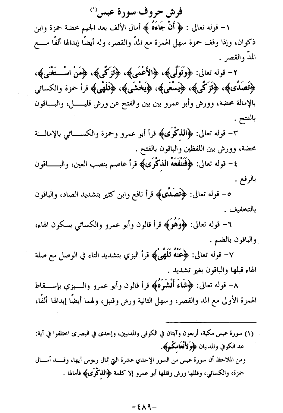 2 - قوله تعالى: وَتَوَلَّى، الْأَعْمى، تزكى، مَنِ اسْتَغْنى، تَصَدَّى، تزكى، يَسْعى، يَخْشى، تَلَهَّى قرأ حمزة والكسائي بالإمالة محضة، وورش وأبو عمرو بين بين والفتح عن ورش قليل، والباقون بالفتح.