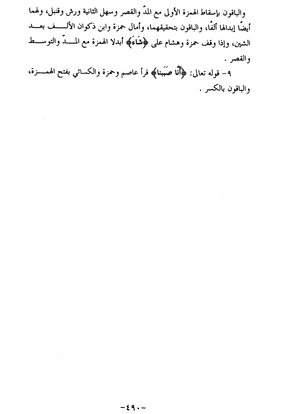 والباقون بإسقاط الهمزة الأولى مع المدّ والقصر وسهل الثانية ورش وقنبل، ولهما أيضا إبدالها ألفا، والباقون بتحقيقهما، وأمال حمزة وابن ذكوان الألف بعد الشين، وإذا وقف حمزة وهشام على شاءَ أبدلا الهمزة مع المدّ والتوسط والقصر.