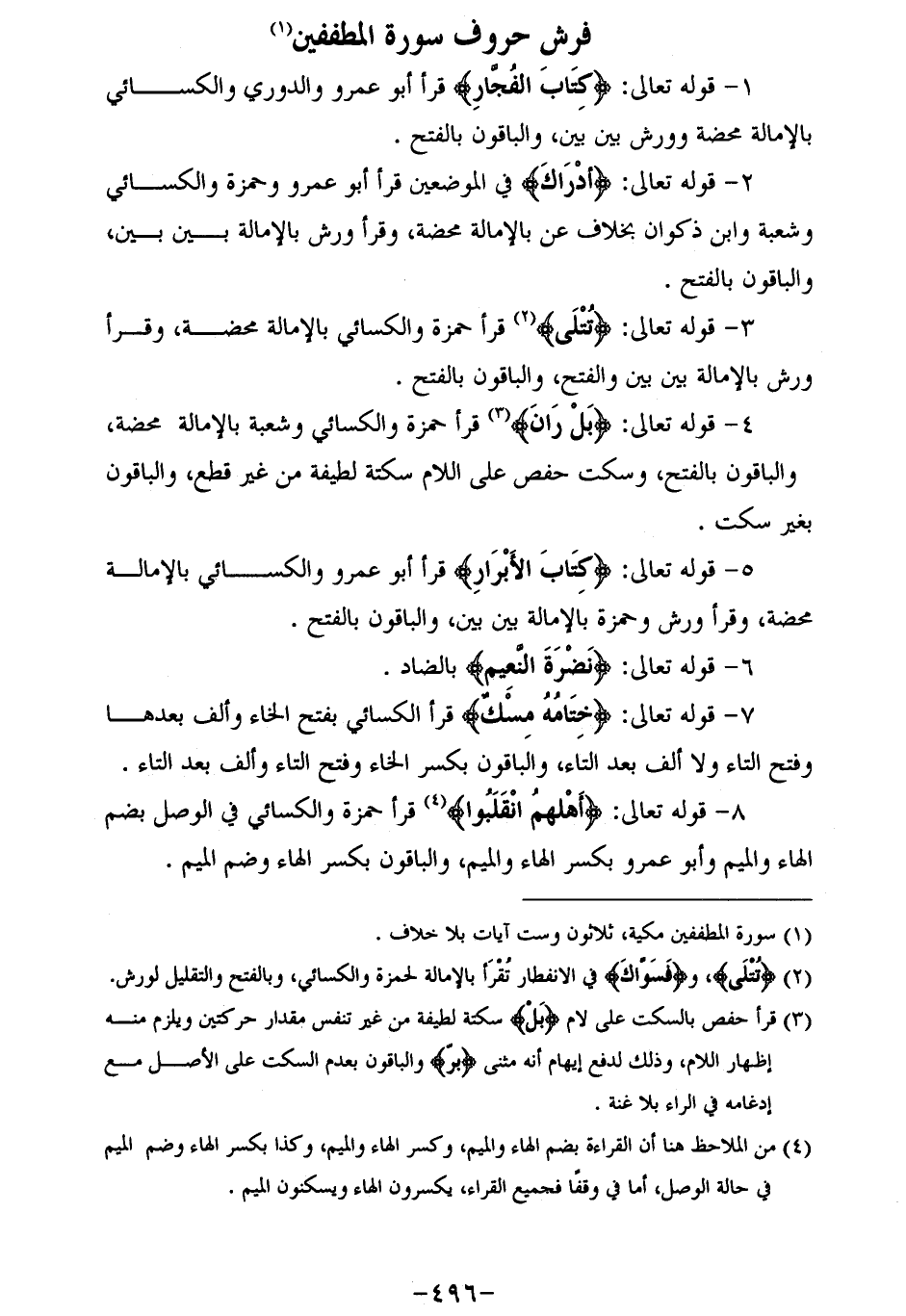 1 - قوله تعالى: كِتابَ الفُجَّارِ قرأ أبو عمرو والدوري والكسائي بالإمالة محضة وورش بين بين، والباقون بالفتح.