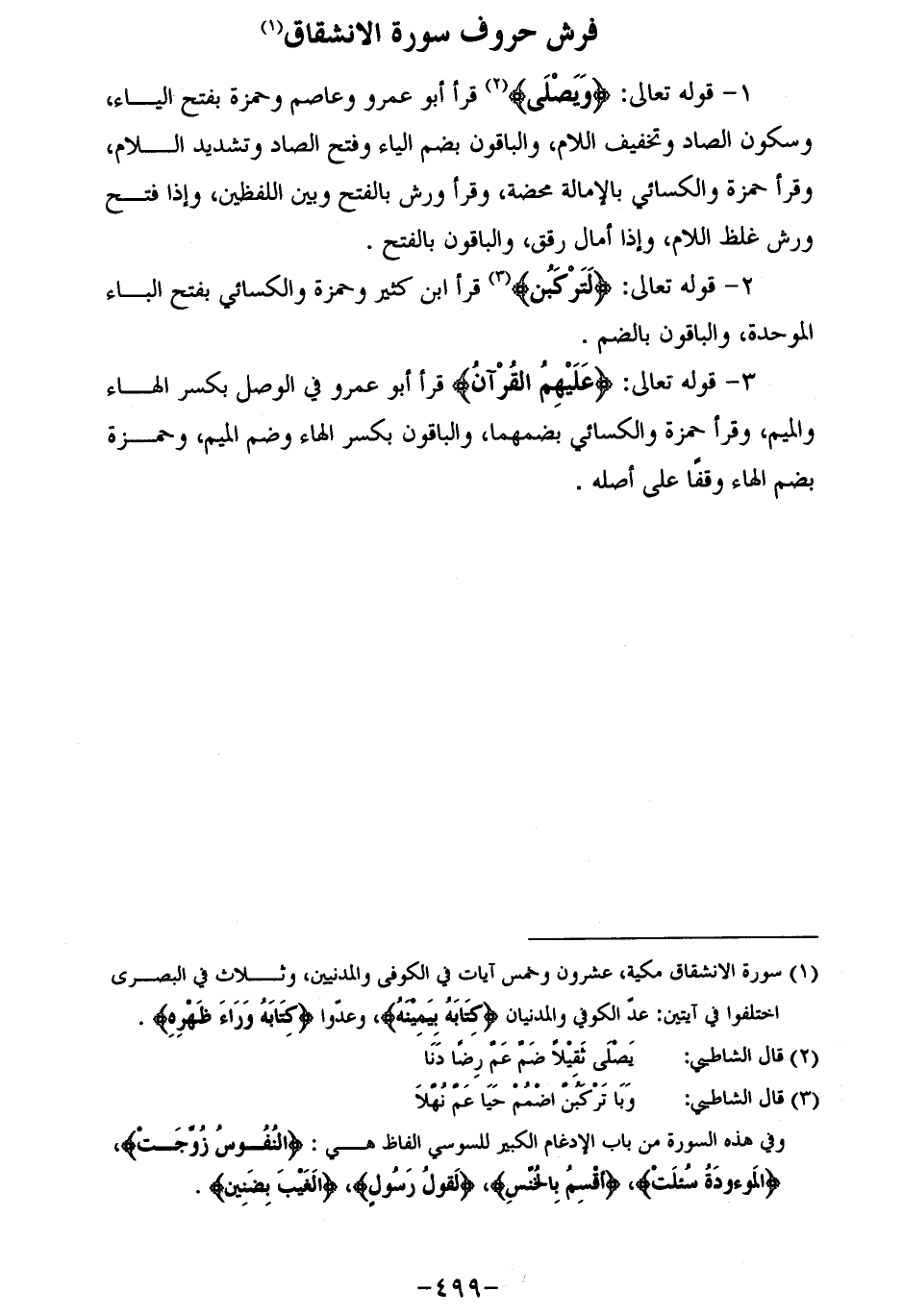 (¬1) سورة الانشقاق مكية، عشرون وخمس آيات في الكوفى والمدنيين، وثلاث في البصرى اختلفوا في آيتين: عدّ الكوفي والمدنيان كِتابَهُ بِيَمِينِهِ، وعدّوا كِتابَهُ وَراءَ ظَهْرِهِ.
