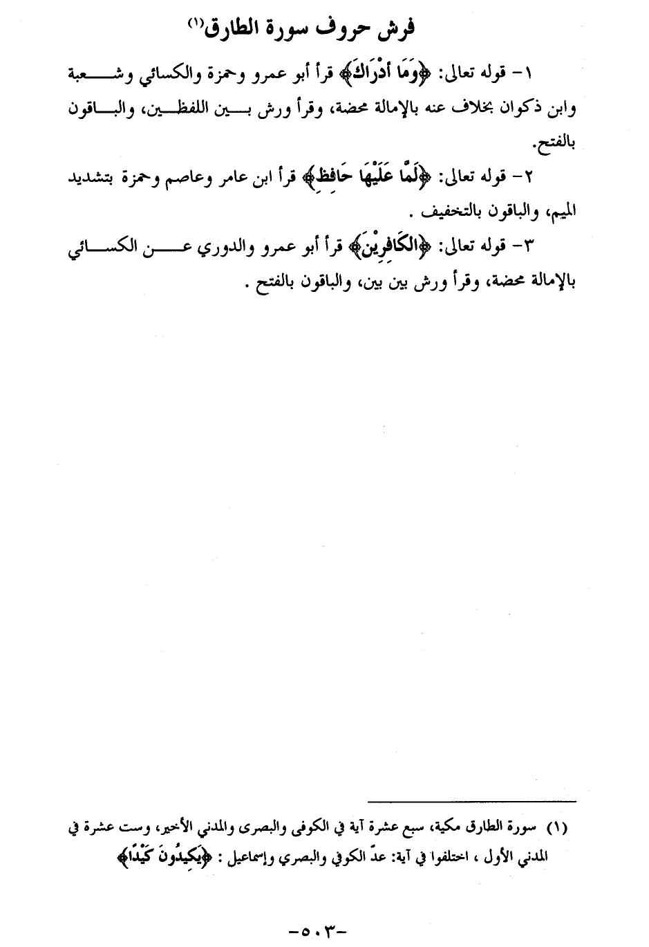 (¬1) سورة الطارق مكية، سبع عشرة آية في الكوفي والبصرى والمدني الأخير، وست عشرة في المدني الأول، اختلفوا في آية: عدّ الكوفي والبصرى وإسماعيل: يَكِيدُونَ كَيْداً