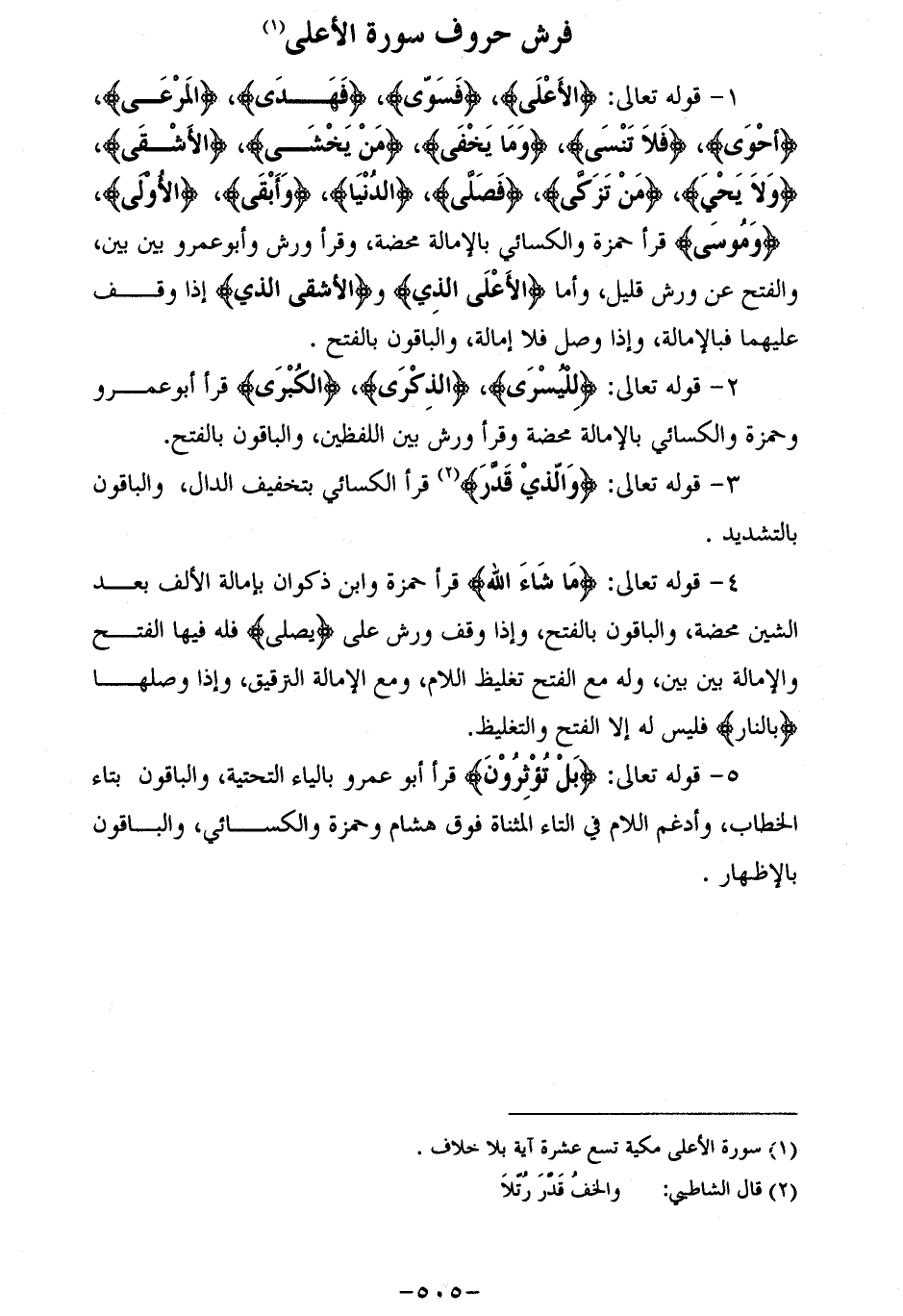 1 - قوله تعالى: الْأَعْلَى، فَسَوَّى، فَهَدى، الْمَرْعى، أَحْوى، فَلا تَنْسى، وَما يَخْفى، مَنْ يَخْشى، الْأَشْقَى، (ولا يحيى)، مَنْ تَزَكَّى، فَصَلَّى، الدُّنْيا، وَأَبْقى، الْأُولى، وَمُوسى قرأ حمزة والكسائي بالإمالة محضة، وقرأ ورش وأبو عمرو بين بين، والفتح عن ورش قليل، وأما الْأَعْلَى الَّذِي والْأَشْقَى الَّذِي إذا وقف عليهما فبالإمالة، وإذا وصل فلا إمالة، والباقون بالفتح.