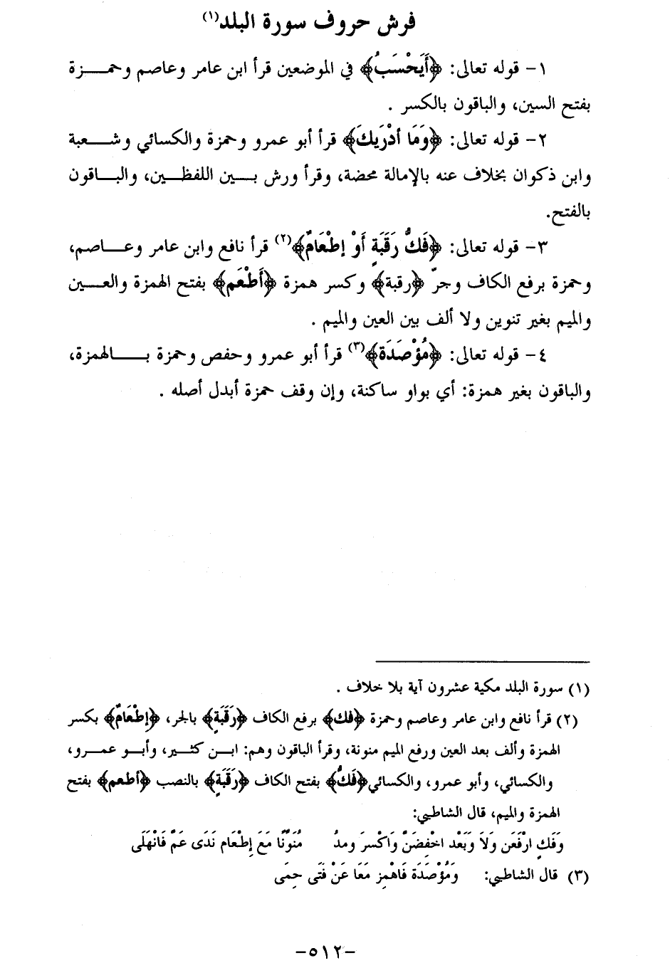 (¬2) قرأ نافع وابن عامر وعاصم وحمزة فَكُّ برفع الكاف رَقَبَةٍ بالجر، (إطعام) بكسر الهمزة وألف بعد العين ورفع الميم منونة، وقرأ الباقون وهم: ابن كثير، وأبو عمرو، والكسائي، وأبو عمرو، والكسائي (فك) بفتح الكاف (رقبة) بالنصب (أطعم) بفتح الهمزة والميم، قال الشاطبي: