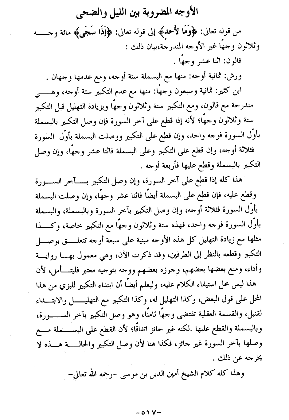 هذا كله إذا قطع على آخر السورة، وإن وصل التكبير بآخر السورة وقطع عليه، فإن قطع على البسملة أيضا فاثنا عشر وجها، وإن وصلت البسملة بأوّل السورة فثلاثة أوجه، وإن وصل التكبير بآخر السورة وبالبسملة، والبسملة بأوّل السورة فوجه واحد، فهذه ستة وثلاثون وجها مع التكبير خاصة، وكذا مثلها مع زيادة التهليل كل هذه الأوجه مبنية على سبعة أوجه تتعلق بوصل التكبير وقطعه بالنظر إلى الطرفين، وقد ذكرت الآن، وهي معمول بها رواية وأداء، ومنع بعضها بعضهم، وجوزه بعضهم ووجه بتوجيه معتبر فليتأمل، لأن هذا ليس محل استيفاء الكلام عليه، وليعلم أيضا أن ابتداء التكبير للبزي من هذا المحل على قول البعض، وكذا التهليل له، وكذا التكبير مع التهليل والابتداء لقنبل، والقسمة العقلية تقتضي وجها ثامنا، وهو وصل التكبير بآخر السورة، وبالبسملة والقطع عليها. لكنه غير جائز اتفاقا؛ لأن القطع على البسملة مع وصلها بآخر السورة غير جائز، فكذا هنا لأن وصل التكبير والحالة هذه لا يخرجه عن ذلك.