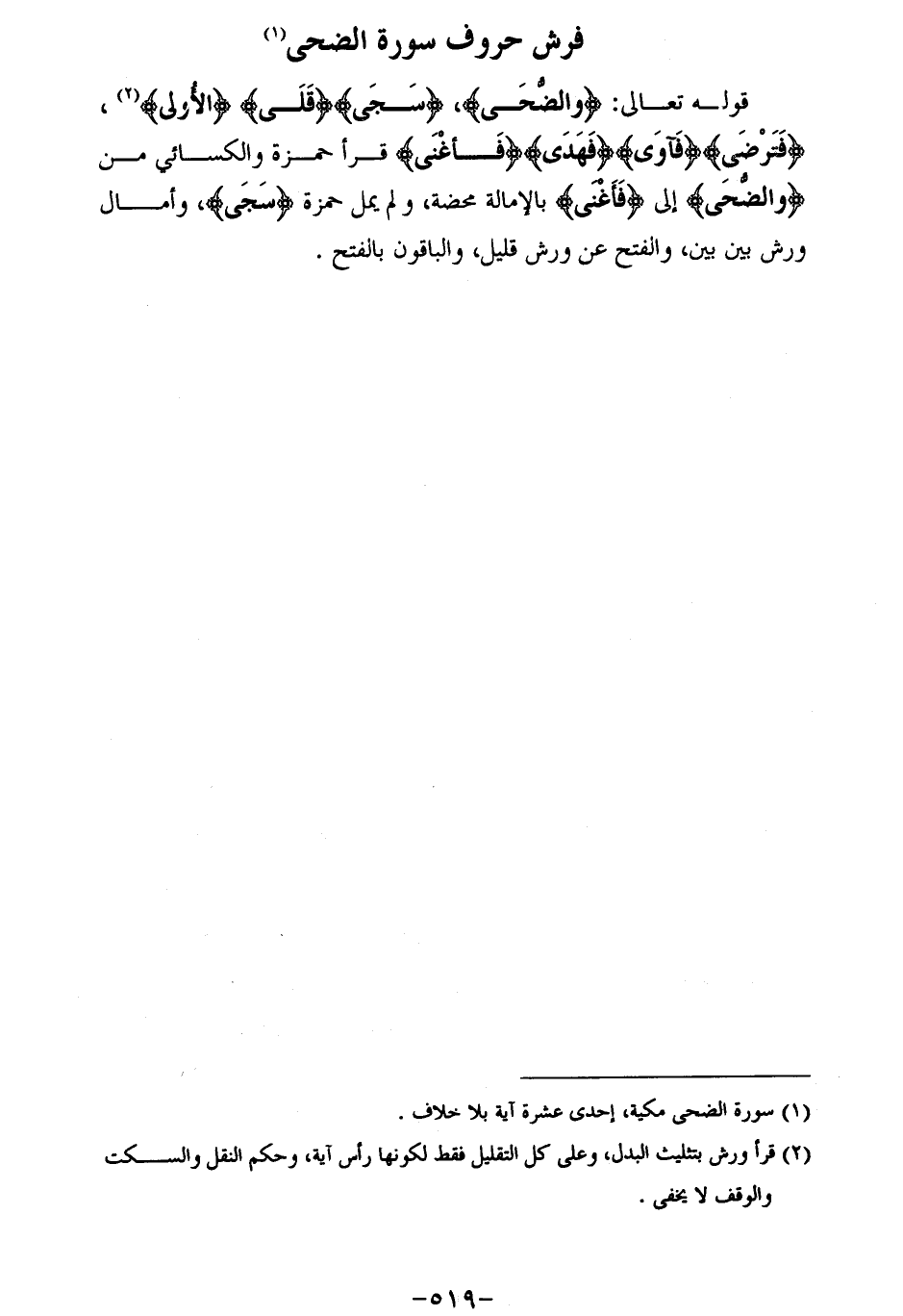 قوله تعالى: وَالضُّحى، سَجى قَلى الْأُولى (¬2)، فَتَرْضى فَآوى فَهَدى فَأَغْنى قرأ حمزة والكسائي من وَالضُّحى إلى فَأَغْنى بالإمالة محضة، ولم يمل حمزة سَجى، وأمال ورش بين بين، والفتح عن ورش قليل، والباقون بالفتح.