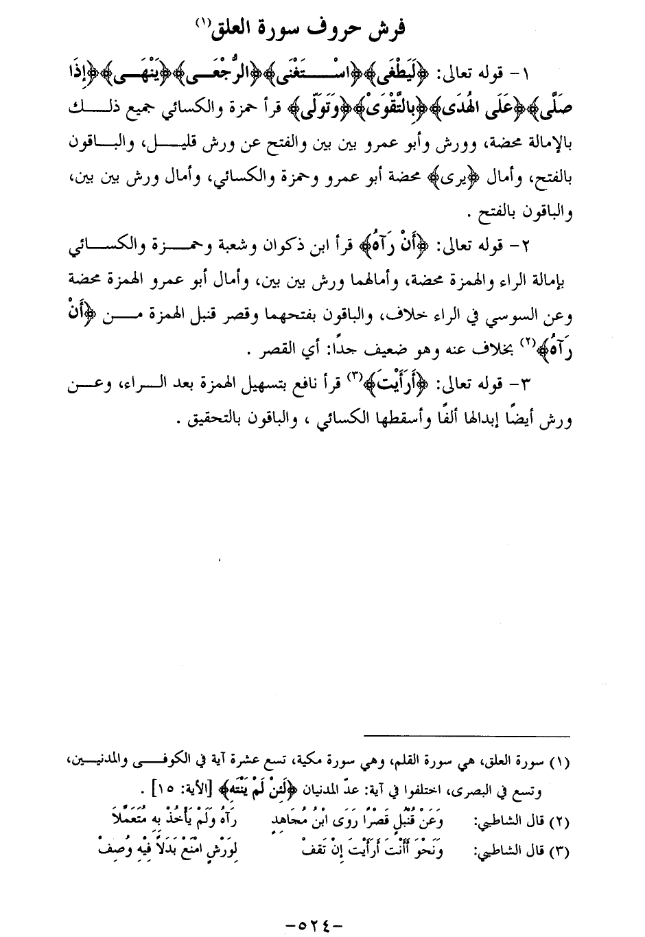 1 - قوله تعالى: لَيَطْغى اسْتَغْنى الرُّجْعى يَنْهى إِذا صَلَّى عَلَى الْهُدى بِالتَّقْوى وَتَوَلَّى قرأ حمزة والكسائي جميع ذلك بالإمالة محضة، وورش وأبو عمرو بين بين والفتح عن ورش قليل، والباقون بالفتح، وأمال يَرى محضة أبو عمرو وحمزة والكسائي، وأمال ورش بين بين، والباقون بالفتح.