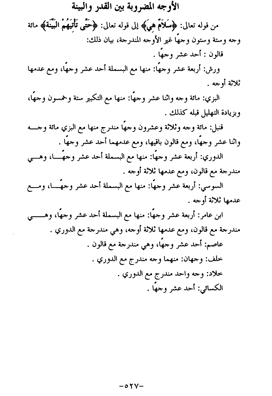 قنبل: مائة وجه وثلاثة وعشرون وجها مندرج منها مع البزي مائة وجه واثنا عشر وجها، ومع قالون باقيها، ومع عدمها أحد عشر وجها.