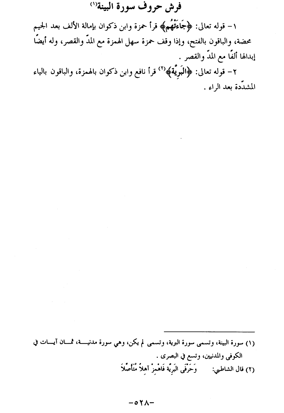 (¬1) سورة البينة، وتسمى سورة البرية، وتسمى لم يكن، وهي سورة مدنية، ثمان آيات في الكوفى والمدنيين، وتسع في البصرى.