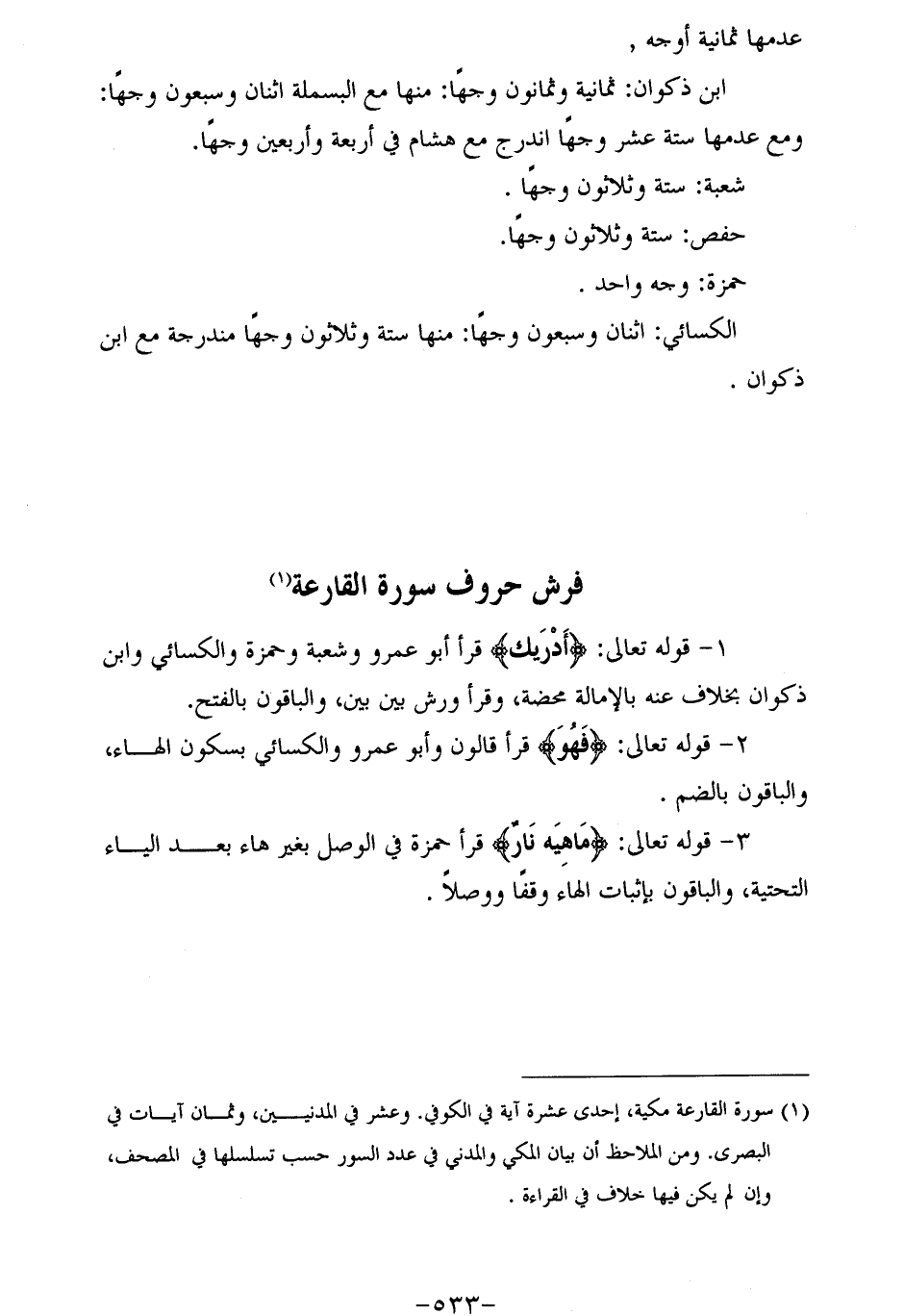 (¬1) سورة القارعة مكية، إحدى عشرة آية في الكوفي. وعشر في المدنيين، وثمان آيات في البصرى. ومن الملاحظ أن بيان المكي والمدني في عدد السور حسب تسلسلها في المصحف، وإن لم يكن فيها خلاف في القراءة.