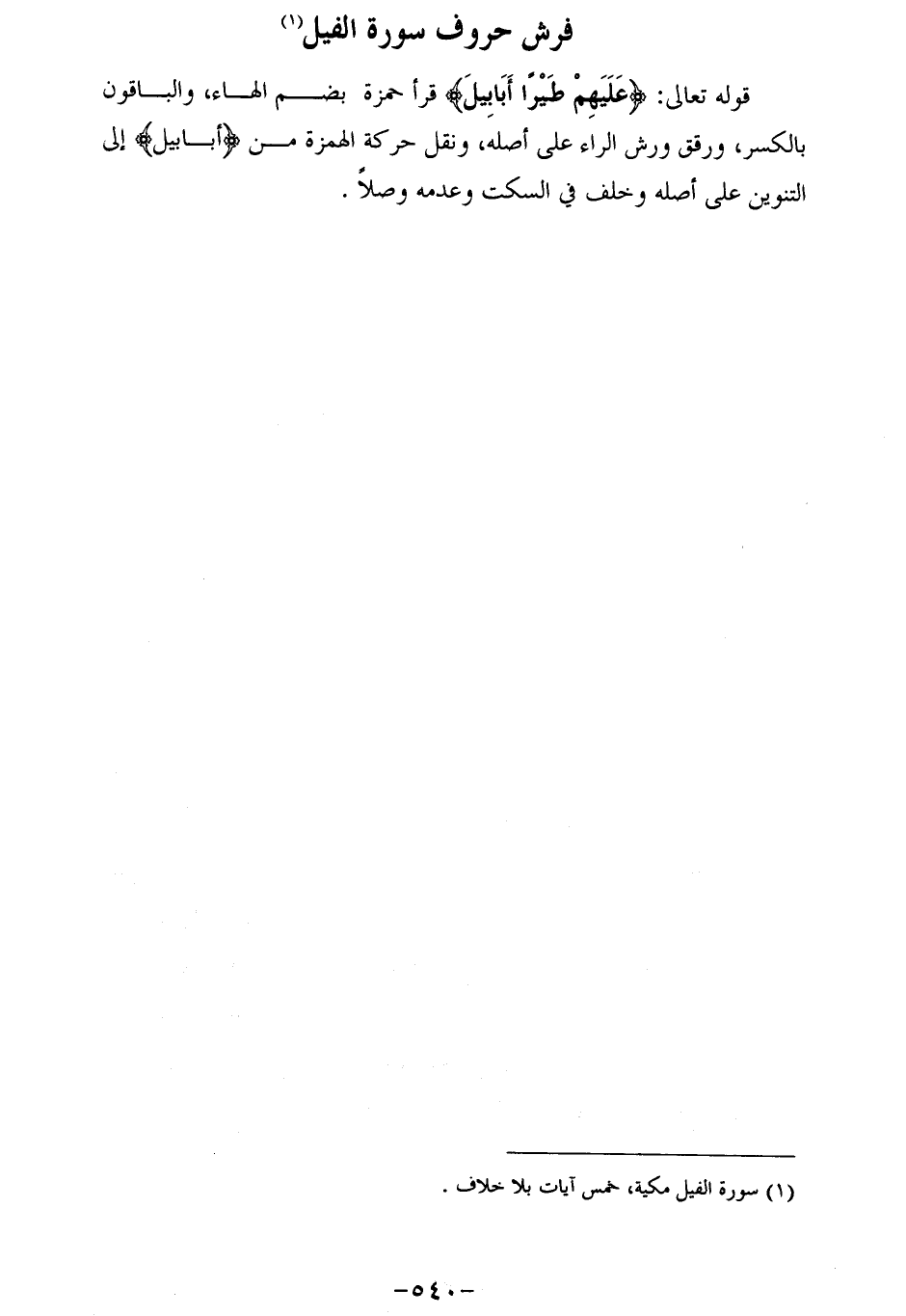 قوله تعالى: عَلَيْهِمْ طَيْراً أَبابِيلَ قرأ حمزة بضم الهاء، والباقون بالكسر، ورقق ورش الراء على أصله، ونقل حركة الهمزة من أَبابِيلَ إلى التنوين على أصله وخلف في السكت وعدمه وصلا.