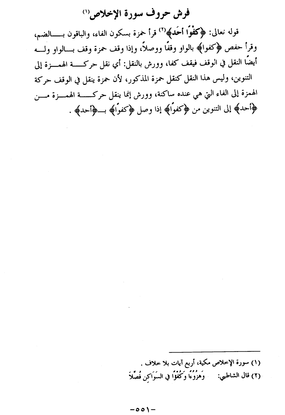 قوله تعالى: كُفُواً أَحَدٌ (¬2) قرأ حمزة بسكون الفاء، والباقون بالضم، وقرأ حفص كُفُواً بالواو وقفا ووصلا، وإذا وقف حمزة وقف بالواو وله أيضا النقل في الوقف فيقف كفا، وورش بالنقل: أي نقل حركة الهمزة إلى التنوين، وليس هذا النقل كنقل حمزة المذكور، لأن حمزة ينقل في الوقف حركة الهمزة إلى الفاء التي هي عنده ساكنة، وورش إنما ينقل حركة الهمزة من أَحَدٌ إلى التنوين من كُفُواً إذا وصل كُفُواً ب أَحَدٌ.