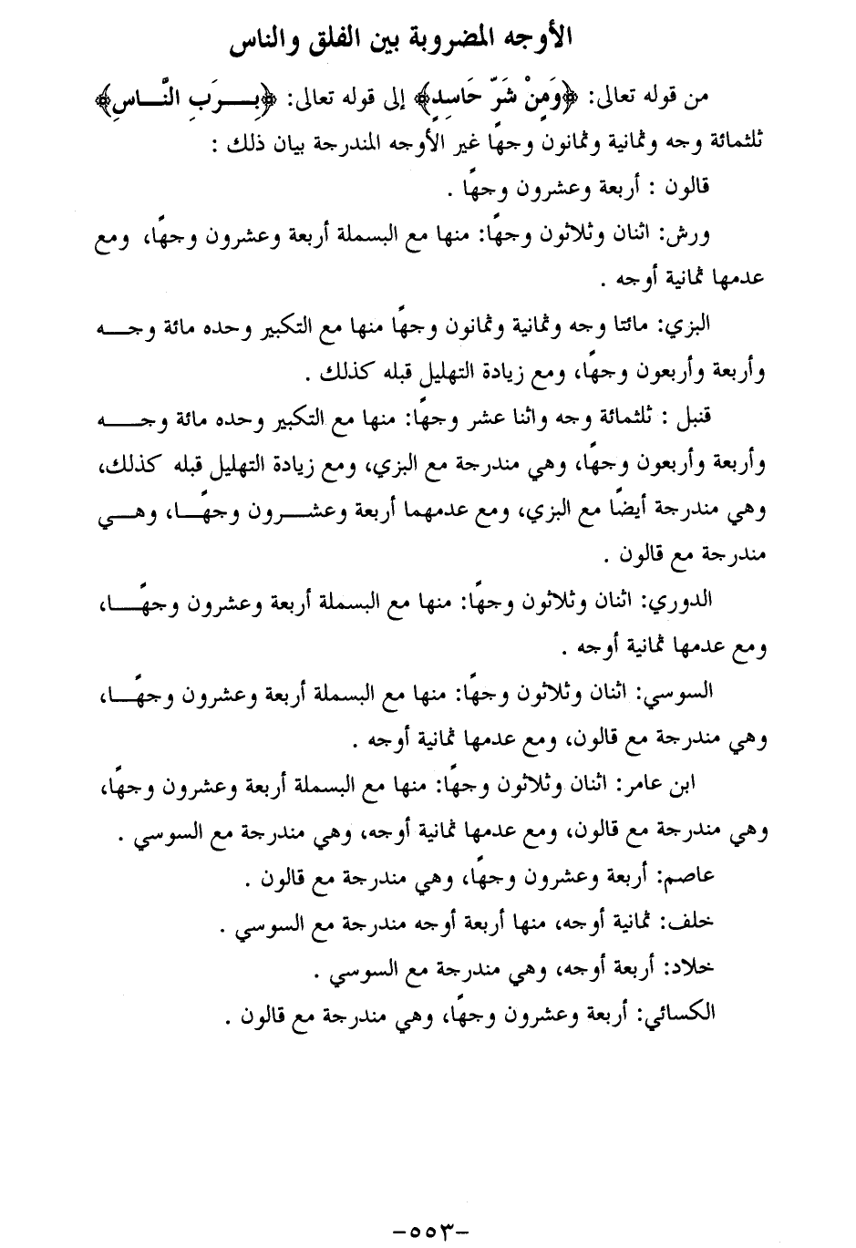 من قوله تعالى: وَمِنْ شَرِّ حاسِدٍ إلى قوله تعالى: بِرَبِّ النَّاسِ ثلاثمائة وجه وثمانية وثمانون وجها غير الأوجه المندرجة بيان ذلك: