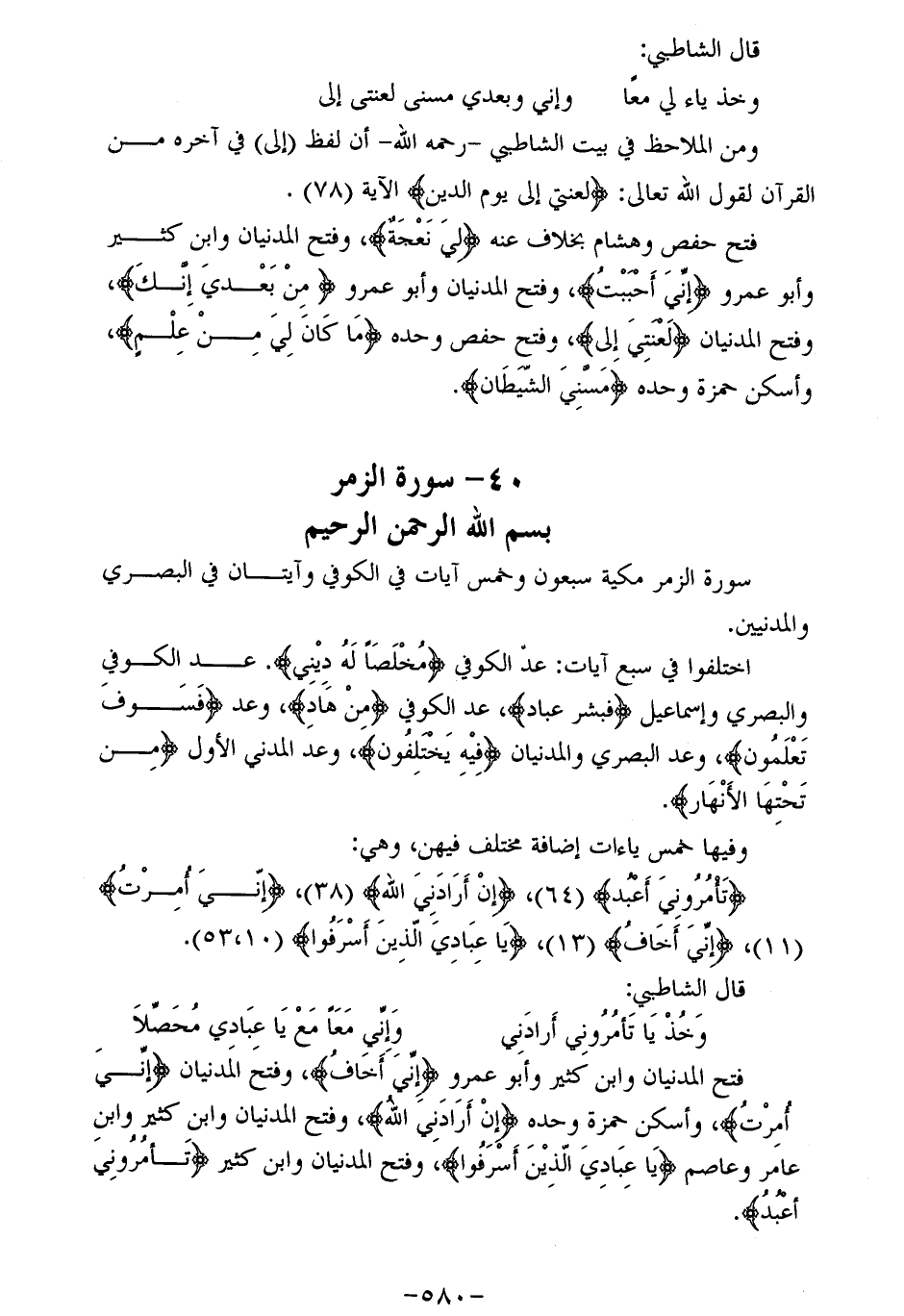 فتح المدنيان وابن كثير وأبو عمرو إِنِّي أَخافُ، وفتح المدنيان (إني أمرت)، وأسكن حمزة وحده إِنْ أَرادَنِيَ اللَّهُ، وفتح المدنيان وابن كثير وابن عامر وعاصم يا عِبادِيَ الَّذِينَ أَسْرَفُوا، وفتح المدنيان وابن كثير تَأْمُرُونِّي أَعْبُدُ.