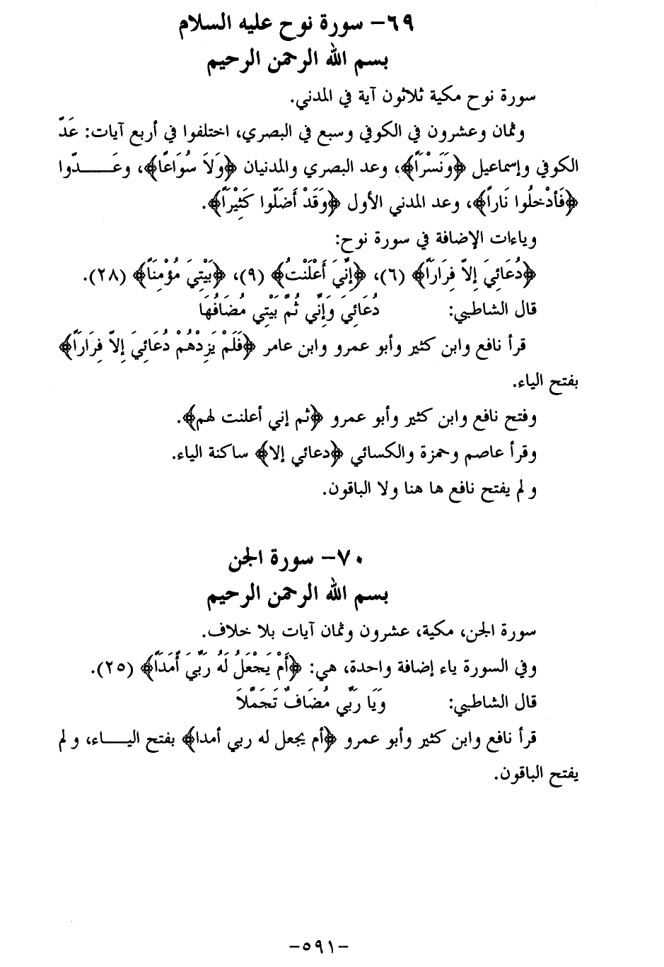 وثمان وعشرون في الكوفي وسبع في البصري، اختلفوا في أربع آيات: عدّ الكوفي وإسماعيل وَنَسْراً، وعد البصري والمدنيان وَلا سُواعاً، وعدّوا فَأُدْخِلُوا ناراً، وعد المدني الأول وَقَدْ أَضَلُّوا كَثِيراً.