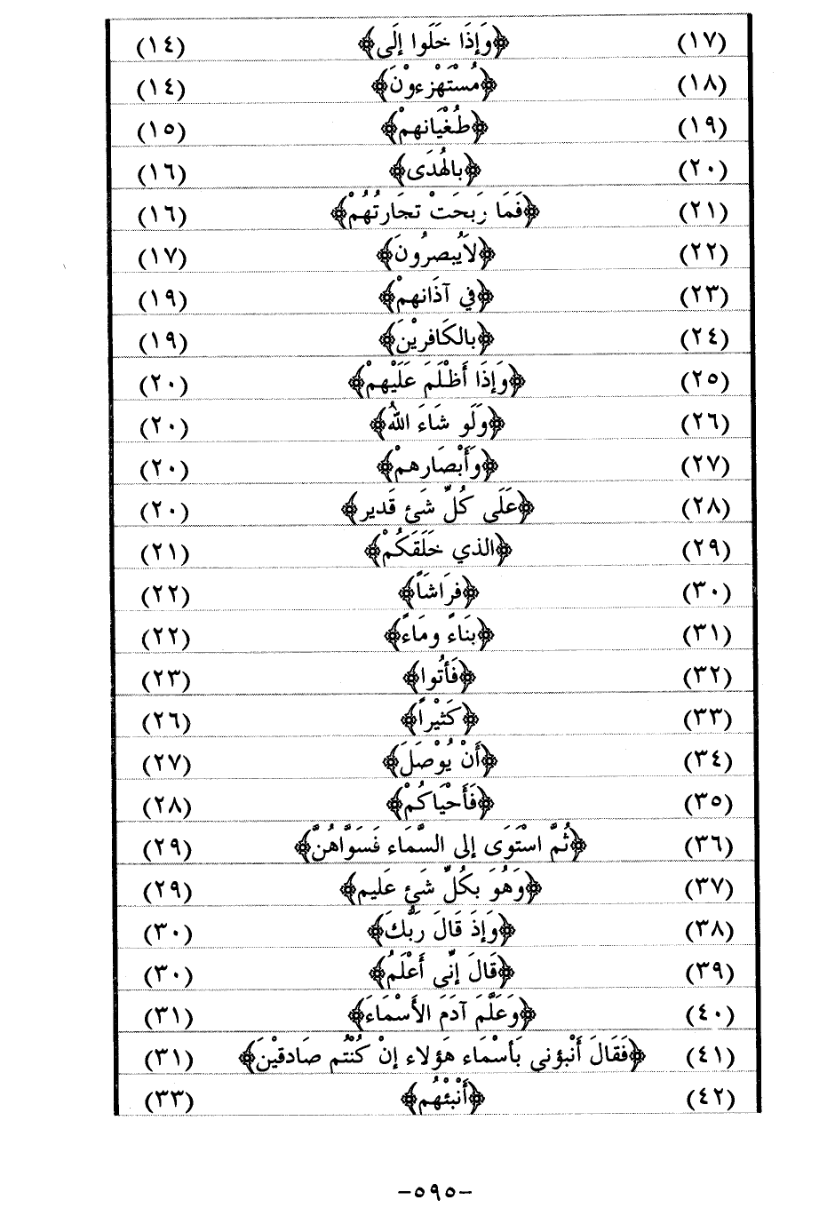 (17) / وَإِذا خَلَوْا إِلى / (14) (18) / مُسْتَهْزِؤُنَ/ (14) (19) / طُغْيانِهِمْ/ (15) (20) / بِالْهُدى / (16) (21) / فَما رَبِحَتْ تِجارَتُهُمْ/ (16) (22) / لا يُبْصِرُونَ/ (17) (23) / فِي آذانِهِمْ/ (19) (24) / بِالْكافِرِينَ/ (19) (25) / وَإِذا أَظْلَمَ عَلَيْهِمْ/ (20) (26) / وَلَوْ شاءَ اللَّهُ/ (20) (27) / وَأَبْصارِهِمْ/ (20) (28) / عَلى كُلِّ شَيْءٍ قَدِيرٌ (20) (29) / الَّذِي خَلَقَكُمْ/ (21) (30) / فِراشاً/ (22) (31) / بناء وماء/ (22) (32) / فَأْتُوا/ (23) (33) / كَثِيراً/ (26) (34) / أَنْ يُوصَلَ/ (27) (35) / فَأَحْياكُمْ/ (28) (36) / ثُمَّ اسْتَوى إِلَى السَّماءِ فَسَوَّاهُنَّ/ (29) (37) / وَهُوَ بِكُلِّ شَيْءٍ عَلِيمٌ/ (29) (38) / وَإِذْ قالَ رَبُّكَ/ (30) (39) / قالَ إِنِّي أَعْلَمُ/ (30) (40) / وَعَلَّمَ آدَمَ الْأَسْماءَ/ (31) (41) / فَقالَ أَنْبِئُونِي بِأَسْماءِ هؤُلاءِ إِنْ كُنْتُمْ صادِقِينَ/ (31) (42) / أَنْبِئْهُمْ/ (33)