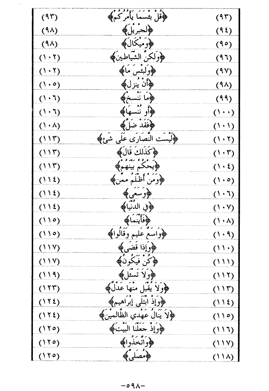 (93) / قُلْ بِئْسَما يَأْمُرُكُمْ/ (93) (94) / لِجِبْرِيلَ/ (98) (95) / وَمِيكالَ/ (98) (96) / وَلكِنَّ الشَّياطِينَ/ (102) (97) / وَلَبِئْسَ ما/ (102) (98) / أَنْ يُنَزَّلَ/ (105) (99) / ما نَنْسَخْ/ (106) (100) / أَوْ نُنْسِها/ (106) (101) / فَقَدْ ضَلَّ/ (108) (102) / لَيْسَتِ النَّصارى عَلى شَيْءٍ/ (113) (103) / كَذلِكَ قالَ/ (113) (104) / يَحْكُمُ بَيْنَهُمْ/ (113) (105) / وَمَنْ أَظْلَمُ مِمَّنْ/ (114) (106) / وَسَعى / (114) (107) / فِي الدُّنْيا/ (114) (108) / فَأَيْنَما/ (115) (109) / واسِعٌ عَلِيمٌ وَقالُوا/ (115) (110) / وَإِذا قَضى / (117) (111) / كُنْ فَيَكُونُ/ (117) (112) / وَلا تُسْئَلُ/ (119) (113) / وَلا يُقْبَلُ مِنْها عَدْلٌ/ (123) (114) / وَإِذِ ابْتَلى إِبْراهِيمَ/ (124) (115) / لا يَنالُ عَهْدِي الظَّالِمِينَ/ (124) (116) / وَإِذْ جَعَلْنَا الْبَيْتَ/ (125) (117) / وَاتَّخِذُوا/ (125) (118) / مُصَلًّى/ (125)