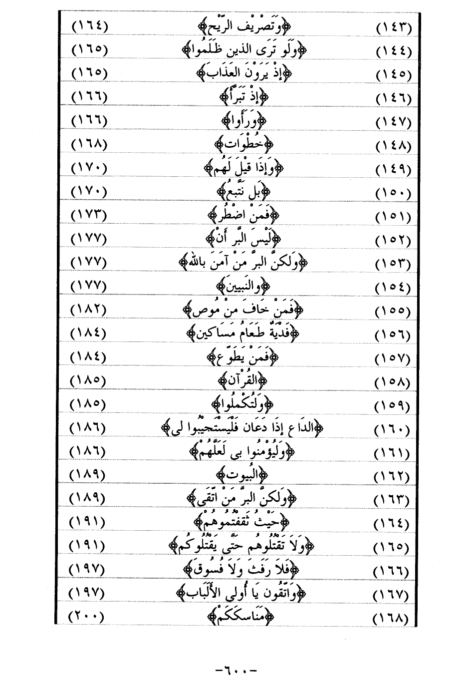 (143) / وتصريف الرّيح/ (164) (144) / ولو ترى الذين ظلموا/ (165) (145) / إِذْ يَرَوْنَ الْعَذابَ/ (165) (146) / إِذْ تَبَرَّأَ/ (166) (147) / وَرَأَوُا/ (166) (148) / خُطُواتِ/ (168) (149) / وَإِذا قِيلَ لَهُمُ/ (170) (150) / بَلْ نَتَّبِعُ/ (170) (151) / فَمَنِ اضْطُرَّ/ (173) (152) / لَيْسَ الْبِرَّ أَنْ/ (177) (153) / وَلكِنَّ الْبِرَّ مَنْ آمَنَ بِاللَّهِ/ (177) (154) / وَالنَّبِيِّينَ/ (177) (155) / فَمَنْ خافَ مِنْ مُوصٍ/ (182) (156) / فدية طعام مساكين/ (184) (157) / فمن يطوّع/ (184) (158) / الْقُرْآنُ/ (185) (159) / وَلِتُكْمِلُوا/ (185) (160) / الدَّاعِ إِذا دَعانِ فَلْيَسْتَجِيبُوا لِي/ (186) (161) / وَلْيُؤْمِنُوا بِي لَعَلَّهُمْ/ (186) (162) / الْبُيُوتَ/ (189) (163) / وَلكِنَّ الْبِرَّ مَنِ اتَّقى / (189) (164) / حَيْثُ ثَقِفْتُمُوهُمْ/ (191) (165) / ولا تقتلوهم حتّى يقتلوكم/ (191) (166) / فَلا رَفَثَ وَلا فُسُوقَ/ (197) (167) / وَاتَّقُونِ يا أُولِي الْأَلْبابِ/ (197) (168) / مَناسِكَكُمْ/ (200)