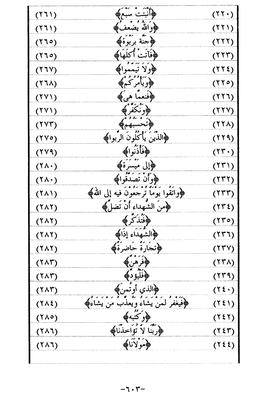 (220) / أَنْبَتَتْ سَبْعَ/ (261) (221) / وَاللَّهُ يُضاعِفُ/ (261) (222) / جَنَّةٍ بِرَبْوَةٍ/ (265) (223) / فَآتَتْ أُكُلَها/ (265) (224) / وَلا تَيَمَّمُوا/ (267) (225) / وَيَأْمُرُكُمْ/ (268) (226) / فَنِعِمَّا هِيَ/ (271) (227) / وَنَكْفُرُ/ (271) (228) / تحسبهم/ (273) (229) / الَّذِينَ يَأْكُلُونَ الرِّبا/ (275) (230) / فَأْذَنُوا/ (279) (231) / إِلى مَيْسَرَةٍ/ (280) (232) / وَأَنْ تَصَدَّقُوا/ (280) (233) / وَاتَّقُوا يَوْماً تُرْجَعُونَ فِيهِ إِلَى اللَّهِ/ (281) (234) / مِنَ الشُّهَداءِ أَنْ تَضِلَّ/ (282) (235) / فَتُذَكِّرَ/ (282) (236) / الشُّهَداءُ إِذا/ (282) (237) / تِجارَةً حاضِرَةً/ (282) (238) / فَرِهانٌ/ (283) (239) / فَلْيُؤَدِّ/ (283) (240) / الَّذِي اؤْتُمِنَ/ (283) (241) / فَيَغْفِرُ لِمَنْ يَشاءُ وَيُعَذِّبُ مَنْ يَشاءُ/ (284) (242) / وَكُتُبِهِ/ (285) (243) / رَبَّنا لا تُؤاخِذْنا/ (286) (244) / مَوْلانا/ (286)
