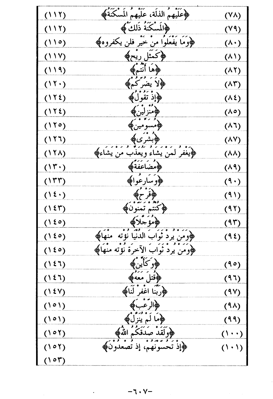 (78) / عَلَيْهِمُ الذِّلَّةُ، عَلَيْهِمُ الْمَسْكَنَةُ/ (112) (79) / الْمَسْكَنَةُ ذلِكَ/ (112) (80) / وَما يَفْعَلُوا مِنْ خَيْرٍ فَلَنْ يُكْفَرُوهُ/ (115) (81) / كَمَثَلِ رِيحٍ/ (117) (82) / ها أَنْتُمْ/ (119) (83) / لا يَضُرُّكُمْ/ (120) (84) / إِذْ تَقُولُ/ (124) (85) / مُنْزَلِينَ/ (124) (86) / مُسَوِّمِينَ/ (125) (87) / بُشْرى / (126) (88) / يغفر لمن يشاء ويعذب من يشاء/ (128) (89) / مُضاعَفَةً/ (130) (90) / وَسارِعُوا/ (133) (91) / قَرْحٌ/ (140) (92) / كُنْتُمْ تَمَنَّوْنَ/ (143) (93) / مُؤَجَّلًا/ (145) (94) / وَمَنْ يُرِدْ ثَوابَ الدُّنْيا نُؤْتِهِ مِنْها/ (145) وَمَنْ يُرِدْ ثَوابَ الْآخِرَةِ نُؤْتِهِ مِنْها/ (145) (95) / وَكَأَيِّنْ/ (146) (96) / قاتَلَ مَعَهُ/ (146) (97) / رَبَّنَا اغْفِرْ لَنا/ (147) (98) / الرُّعْبَ/ (151) (99) / ما لَمْ يُنَزِّلْ/ (151) (100) / وَلَقَدْ صَدَقَكُمُ اللَّهُ/ (152) (101) / إِذْ تَحُسُّونَهُمْ، إِذْ تُصْعِدُونَ/ (152) (153)