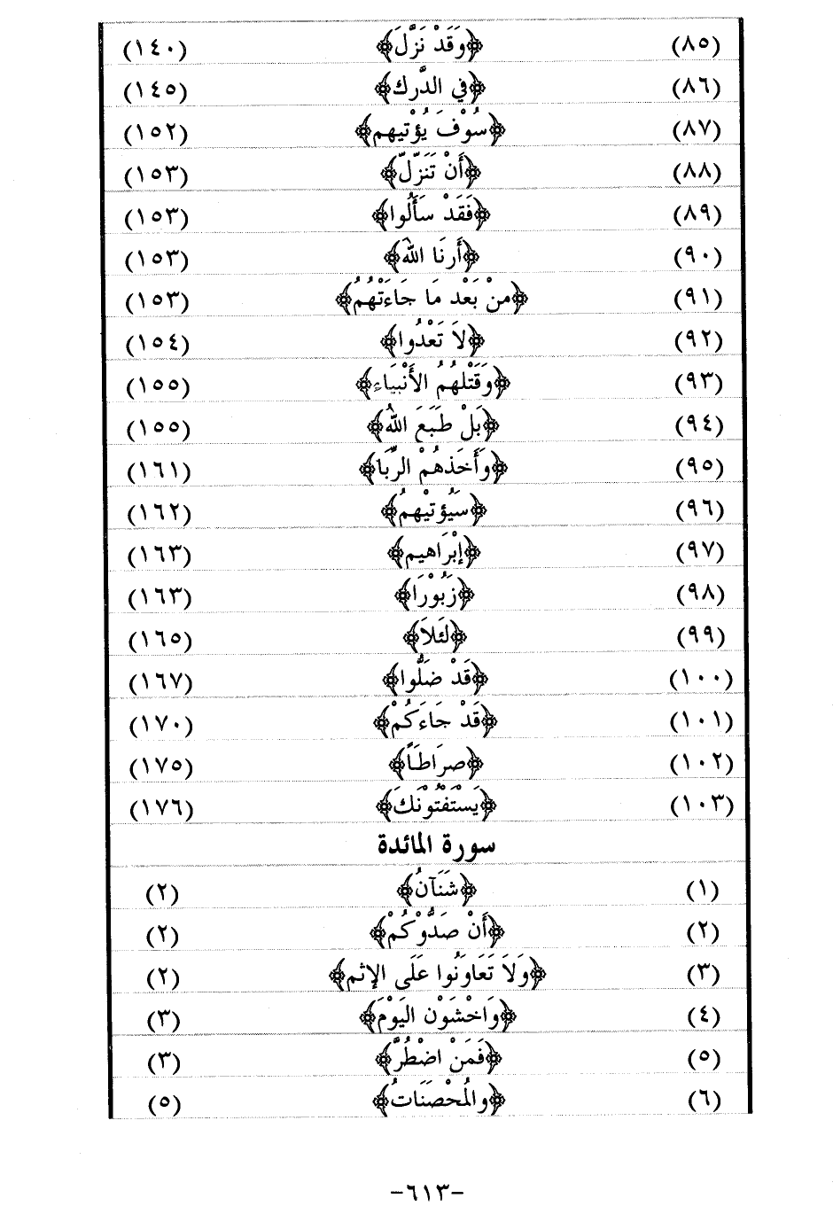 (85) / وَقَدْ نَزَّلَ/ (140) (86) / فِي الدَّرْكِ/ (145) (87) / سَوْفَ يُؤْتِيهِمْ/ (152) (88) / أَنْ تُنَزِّلَ/ (153) (89) / فَقَدْ سَأَلُوا/ (153) (90) / أَرِنَا اللَّهَ/ (153) (91) / مِنْ بَعْدِ ما جاءَتْهُمُ/ (153) (92) / لا تَعْدُوا/ (154) (93) / وَقَتْلِهِمُ الْأَنْبِياءَ/ (155) (94) / بَلْ طَبَعَ اللَّهُ/ (155) (95) / وأخذهم الرّبا/ (161) (96) / سيؤتيهم/ (162) (97) / إِبْراهِيمَ/ (163) (98) / زَبُوراً/ (163) (99) / لِئَلَّا/ (165) (100) / قَدْ ضَلُّوا/ (167) (101) / قَدْ جاءَكُمُ/ (170) (102) / صِراطاً/ (175) (103) / يَسْتَفْتُونَكَ/ (176)