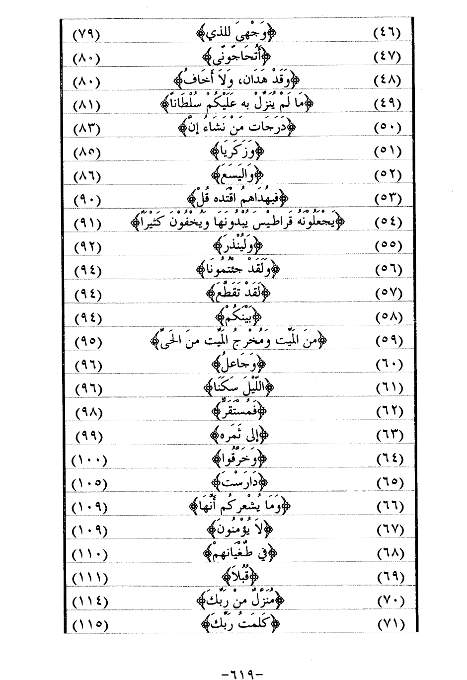 (46) / وَجْهِيَ لِلَّذِي/ (79) (47) / أَتُحاجُّونِّي/ (80) (48) / وَقَدْ هَدانِ، وَلا أَخافُ/ (80) (49) / ما لَمْ يُنَزِّلْ بِهِ عَلَيْكُمْ سُلْطاناً/ (81) (50) / دَرَجاتٍ مَنْ نَشاءُ إِنَّ/ (83) (51) / وَزَكَرِيَّا/ (85) (52) / وَالْيَسَعَ/ (86) (53) / فَبِهُداهُمُ اقْتَدِهْ قُلْ/ (90) (54) / يجعلونه قراطيس يبدونها ويخفون كثيرا/ (91) (55) / ولينذر/ (92) (56) / وَلَقَدْ جِئْتُمُونا/ (94) (57) / لَقَدْ تَقَطَّعَ/ (94) (58) / بَيْنَكُمْ/ (94) (59) / مِنَ الْمَيِّتِ وَمُخْرِجُ الْمَيِّتِ مِنَ الْحَيِّ/ (95) (60) / وَجاعِلُ/ (96) (61) / اللَّيْلَ سَكَناً/ (96) (62) / فَمُسْتَقَرٌّ/ (98) (63) / إِلى ثَمَرِهِ/ (99) (64) / وَخَرَقُوا/ (100) (65) / دارست/ (105) (66) / وَما يُشْعِرُكُمْ أَنَّها/ (109) (67) / لا يُؤْمِنُونَ/ (109) (68) / فِي طُغْيانِهِمْ/ (110) (69) / قُبُلًا/ (111) (70) / مُنَزَّلٌ مِنْ رَبِّكَ/ (114) (71) / كَلِمَتُ رَبِّكَ/ (115)