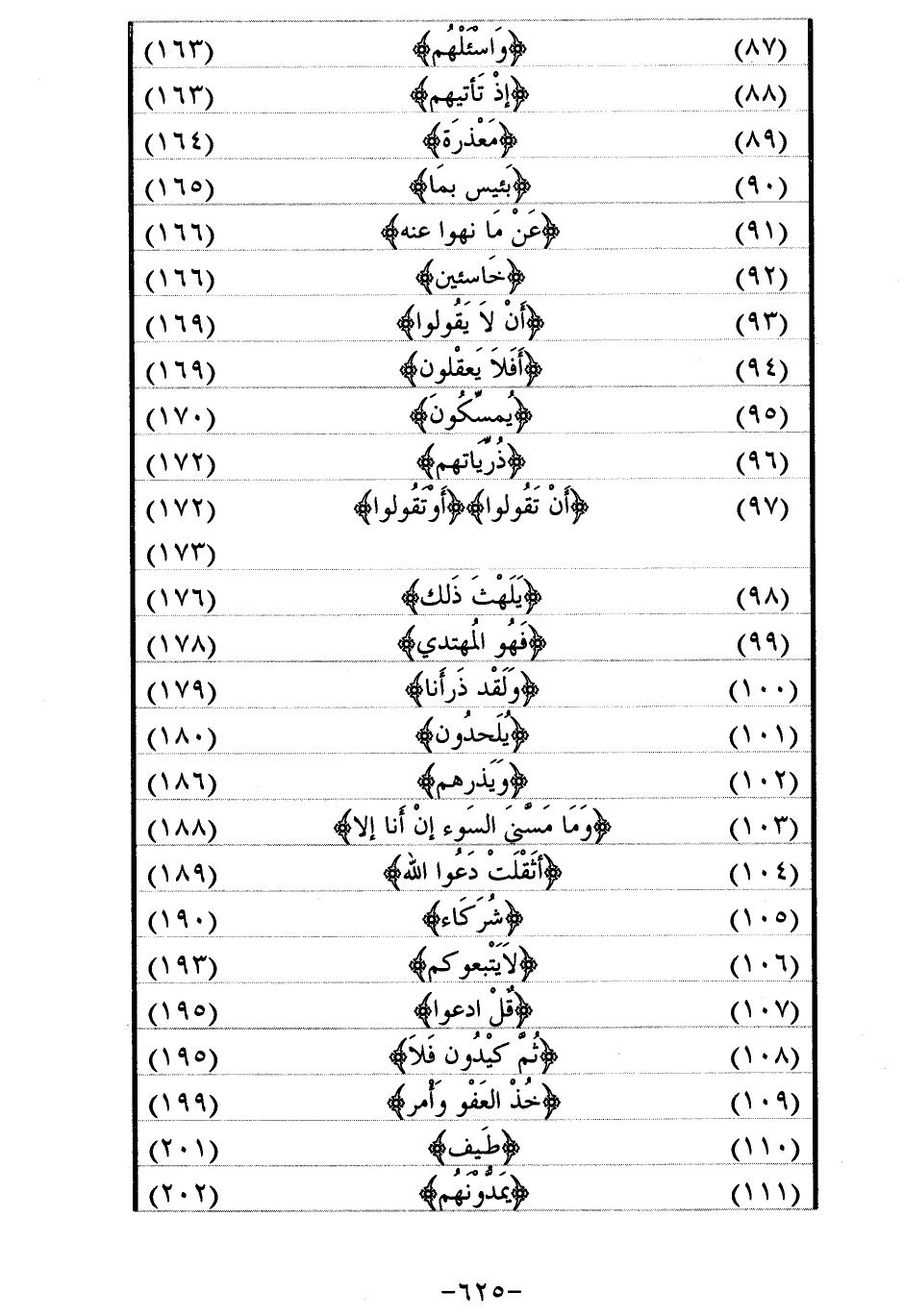 (87) / واسئلهم/ (163) (88) / إِذْ تَأْتِيهِمْ/ (163) (89) / مَعْذِرَةً/ (164) (90) / بَئِيسٍ بِما/ (165) (91) / عَنْ ما نُهُوا عَنْهُ/ (166) (92) / خاسِئِينَ/ (166) (93) / أَنْ لا يَقُولُوا/ (169) (94) / أَفَلا يَعْقِلُونَ/ (169) (95) / يُمَسِّكُونَ/ (170) (96) / ذرياتهم/ (172) (97) / أن تقولوا/،/ أو تقولوا/ (172) (173) (98) / يَلْهَثْ ذلِكَ/ (176) (99) / فَهُوَ الْمُهْتَدِي/ (178) (100) / وَلَقَدْ ذَرَأْنا/ (179) (101) / يُلْحِدُونَ/ (180) (102) / وَيَذَرُهُمْ/ (186) (103) / وَما مَسَّنِيَ السُّوءُ إِنْ أَنَا إِلَّا/ (188) (104) / أَثْقَلَتْ دَعَوَا اللَّهَ/ (189) (105) / شُرَكاءَ/ (190) (106) / لا يَتَّبِعُوكُمْ/ (193) (107) / قُلِ ادْعُوا/ (195) (108) / ثُمَّ كِيدُونِ فَلا/ (195) (109) / خُذِ الْعَفْوَ وَأْمُرْ/ (199) (110) / طيف/ (201) (111) / يَمُدُّونَهُمْ/ (202)