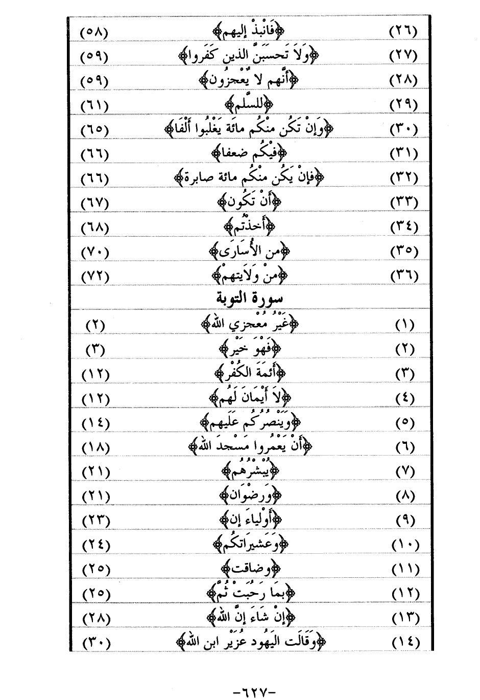 (1) / غَيْرُ مُعْجِزِي اللَّهِ/ (2) (2) / فَهُوَ خَيْرٌ/ (3) (3) / أَئِمَّةَ الْكُفْرِ/ (12) (4) / لا أَيْمانَ لَهُمْ/ (12) (5) / وَيَنْصُرْكُمْ عَلَيْهِمْ/ (14) (6) / أن يعمروا مسجد الله/ (18) (7) / يُبَشِّرُهُمْ/ (21) (8) / وَرِضْوانٍ/ (21) (9) / أَوْلِياءَ إِنِ/ (23) (10) / وعشيراتكم/ (24) (11) / وَضاقَتْ/ (25) (12) / بِما رَحُبَتْ ثُمَّ/ (25) (13) / إِنْ شاءَ إِنَّ اللَّهَ/ (28) (14) / وَقالَتِ الْيَهُودُ عُزَيْرٌ ابْنُ اللَّهِ/ (30)