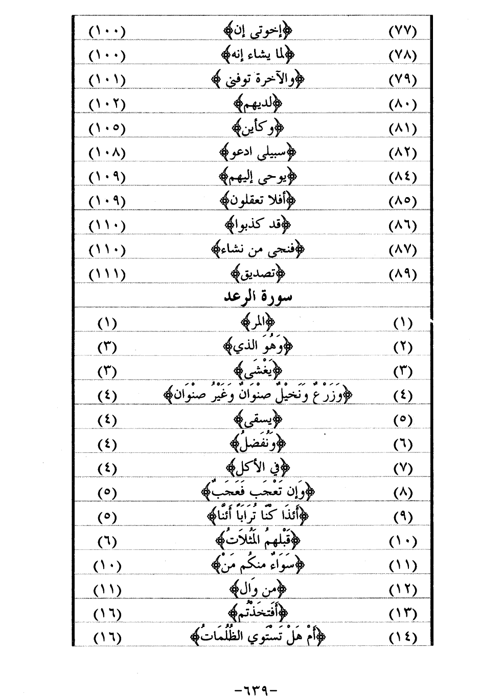 (1) / المر/ (1) (2) / وَهُوَ الَّذِي/ (3) (3) / يُغْشِي/ (3) (4) / وَزَرْعٌ وَنَخِيلٌ صِنْوانٌ وَغَيْرُ صِنْوانٍ/ (4) (5) / يُسْقى / (4) (6) / وَنُفَضِّلُ/ (4) (7) / فِي الْأُكُلِ/ (4) (8) / وَإِنْ تَعْجَبْ فَعَجَبٌ/ (5) (9) / أَإِذا كُنَّا تُراباً أَإِنَّا/ (5) (10) / قَبْلِهِمُ الْمَثُلاتُ/ (6) (11) / سَواءٌ مِنْكُمْ مَنْ/ (10) (12) / مِنْ والٍ/ (11) (13) / أفتخذتم/ (16) (14) / أَمْ هَلْ تَسْتَوِي الظُّلُماتُ/ (16)