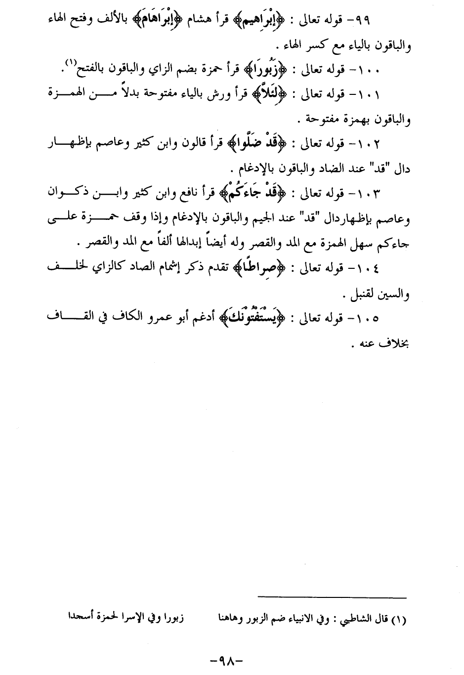 99 - قوله تعالى: إِبْراهِيمَ قرأ هشام (إبراهام) بالألف وفتح الهاء والباقون بالياء مع كسر الهاء.