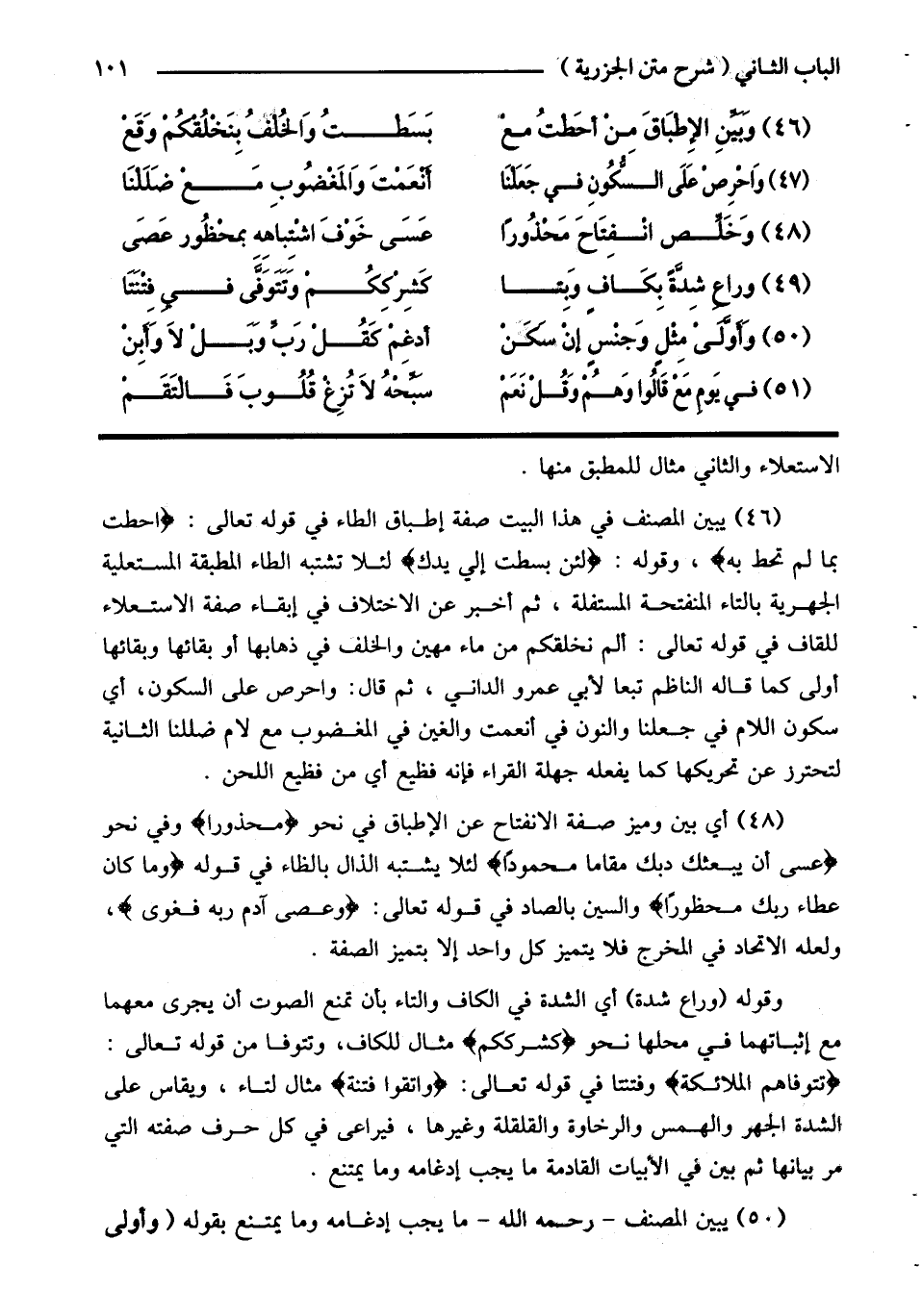 (46) يبين المصنف في هذا البيت صفة إطباق الطاء في قوله تعالى: أَحَطْتُ بِما لَمْ تُحِطْ بِهِ، وقوله: لَئِنْ بَسَطْتَ إِلَيَّ يَدَكَ لئلا تشتبه الطاء المطبقة المستعلية الجهرية بالتاء المنفتحة المستفلة، ثم أخبر عن الاختلاف في إبقاء صفة الاستعلاء للقاف في قوله تعالى: ألم نخلقكم من ماء مهين والخلف في ذهابها أو بقائها وبقائها أولى كما قاله الناظم تبعا لأبي عمرو الداني، ثم قال: واحرص على السكون، أي سكون اللام في جعلنا والنون في أنعمت والغين في المغضوب مع لام ضللنا الثانية لتحترز عن تحريكها كما يفعله جهلة القراء فإنه فظيع أي من فظيع اللحن.