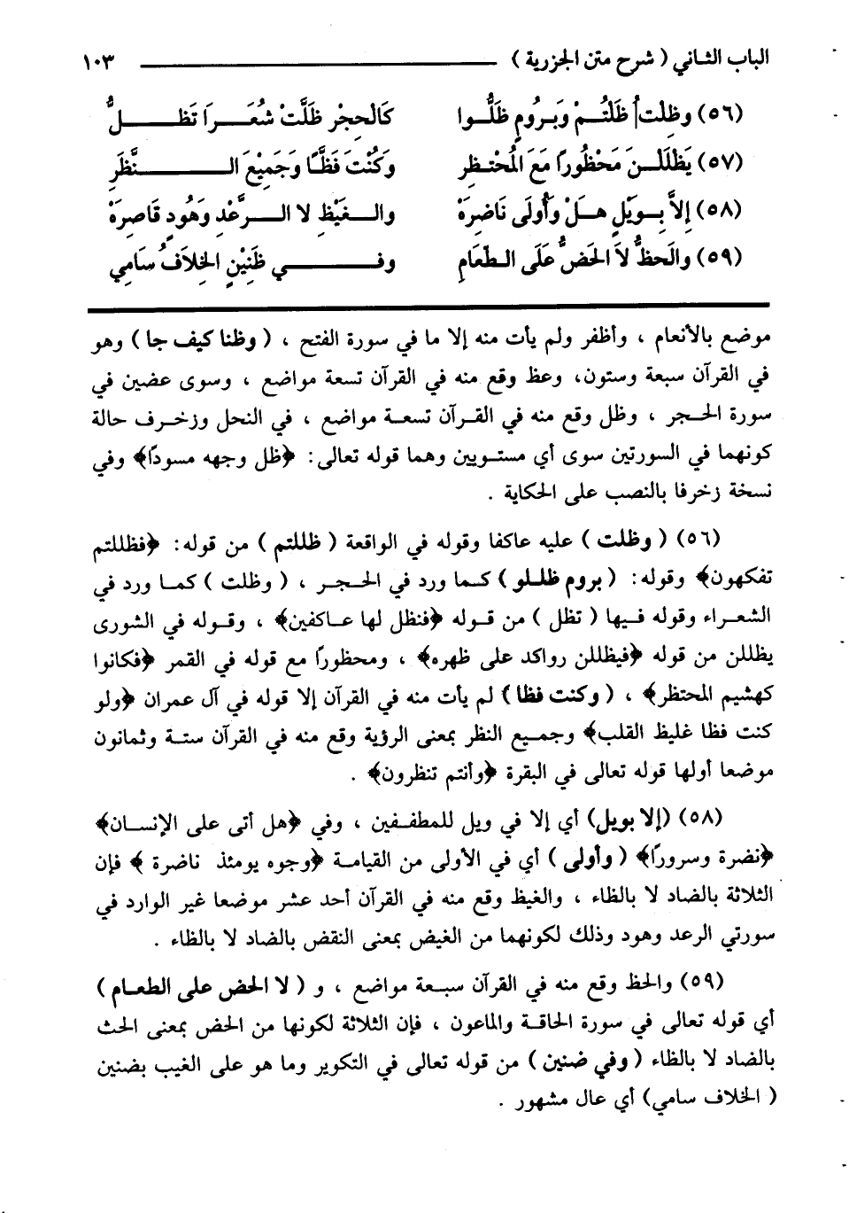 (59) والحظ وقع منه في القرآن سبعة مواضع، و (لا الحض على الطعام) أي قوله تعالى في سورة الحاقة والماعون، فإن الثلاثة لكونها من الحض بمعنى الحث بالضاد لا بالظاء (وفي ضنين) من قوله تعالى في التكوير وما هو على الغيب بضنين (الخلاف سامي) أي عال مشهور.