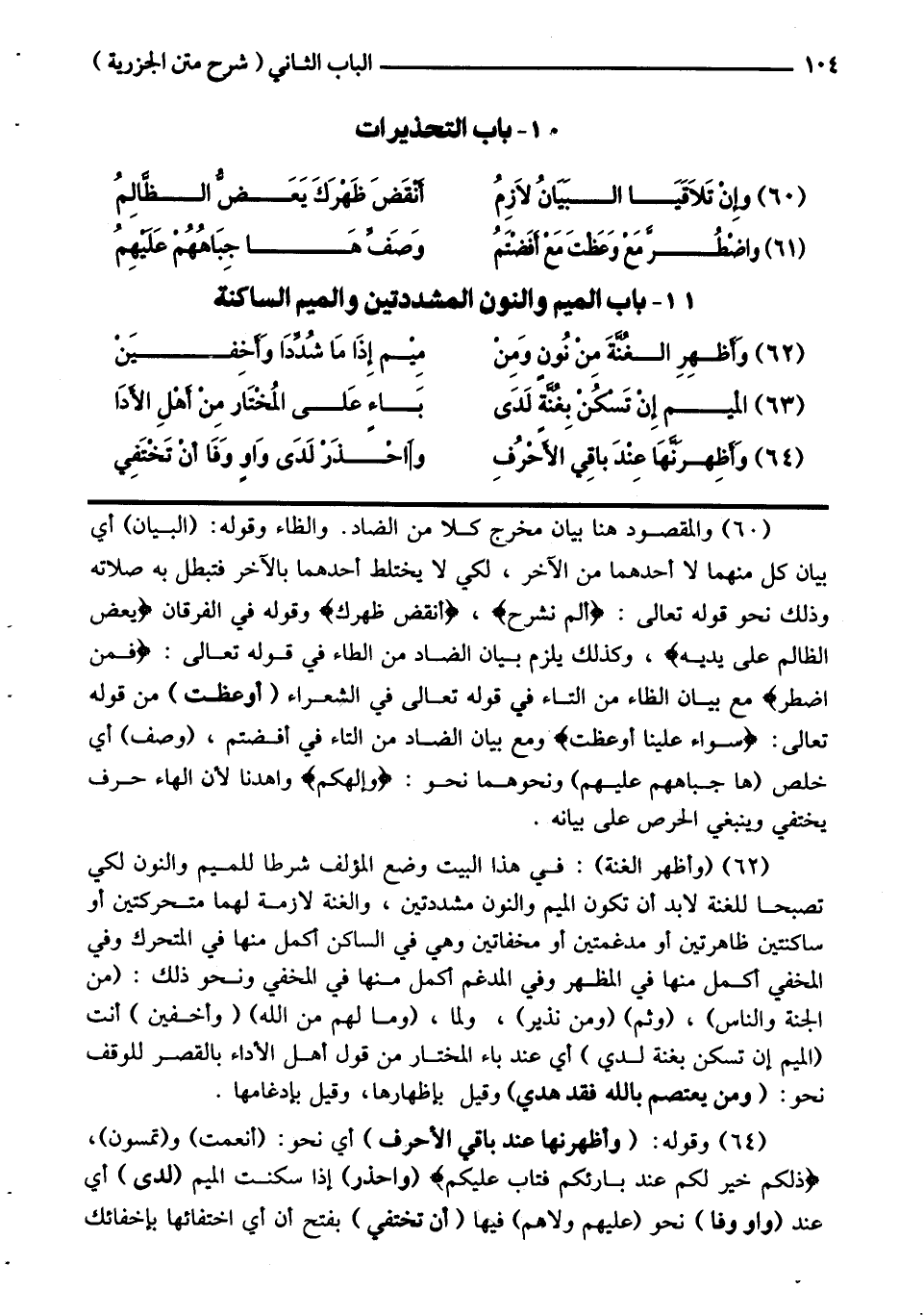 (62) (وأظهر الغنة): في هذا البيت وضع المؤلف شرطا للميم والنون لكي تصبحا للغنة لا بد أن تكون الميم والنون مشددتين، والغنة لازمة لهما متحركتين أو ساكنتين ظاهرتين أو مدغمتين أو مخفاتين وهي في الساكن أكمل منها في المتحرك وفي المخفي أكمل منها في المظهر وفي المدغم أكمل منها في المخفي ونحو ذلك: (من الجنة والناس)، (وثم) (ومن نذير)، ولما، (وما لهم من الله) (وأخفين) أنت (الميم إن تسكن بغنة لدي) أي عند باء المختار من قول أهل الأداء بالقصر للوقف نحو: (ومن يعتصم بالله فقد هدي) وقيل بإظهارها، وقيل بإدغامها.