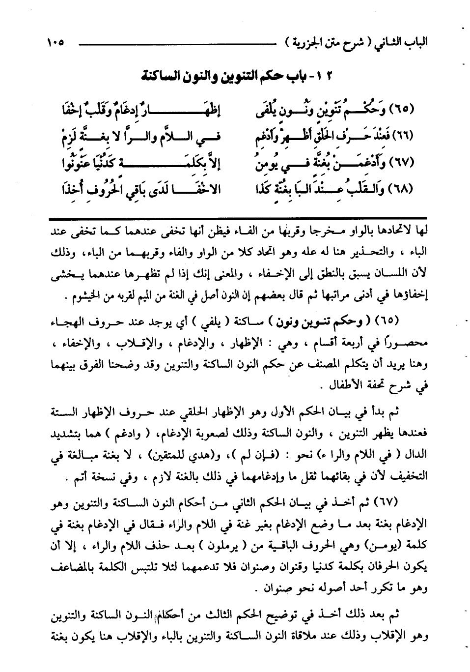 (65) (وحكم تنوين ونون) ساكنة (يلفي) أي يوجد عند حروف الهجاء محصورا في أربعة أقسام، وهي: الإظهار، والإدغام، والإقلاب، والإخفاء، وهنا يريد أن يتكلم المصنف عن حكم النون الساكنة والتنوين وقد وضحنا الفرق بينهما في شرح تحفة الأطفال.