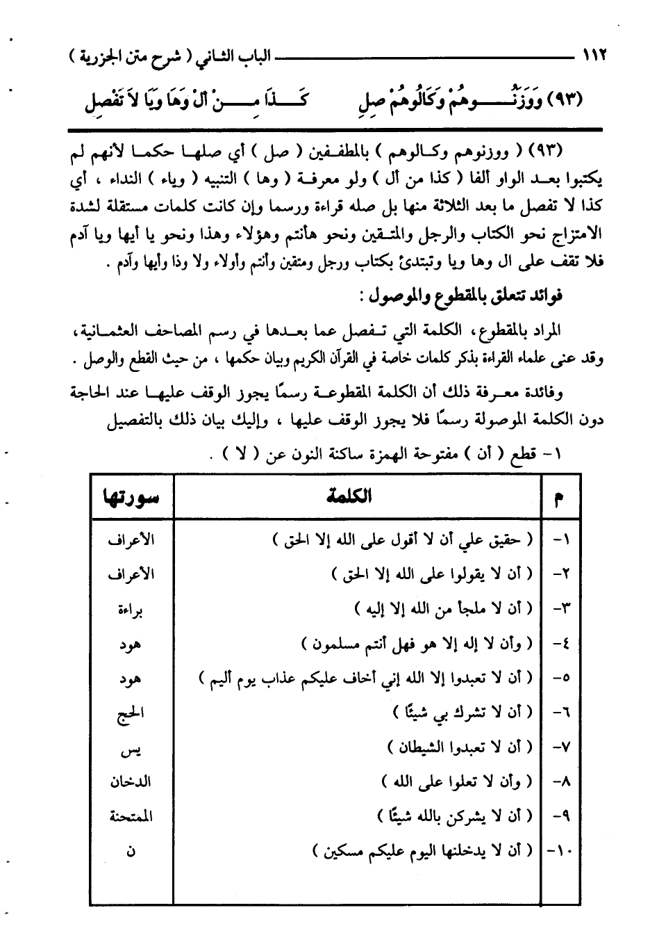 (93) (ووزنوهم وكالوهم) بالمطففين (صل) أي صلها حكما لأنهم لم يكتبوا بعد الواو ألفا (كذا من أل) ولو معرفة (وها) التنبيه (وياء) النداء، أي كذا لا تفصل ما بعد الثلاثة منها بل صله قراءة ورسما وإن كانت كلمات مستقلة لشدة الامتزاج نحو الكتاب والرجل والمتقين ونحو هأنتم وهؤلاء وهذا ونحو يا أيها ويا آدم فلا تقف على ال وها ويا وتبتدئ بكتاب ورجل ومتقين وأنتم وأولاء ولا وذا وأيها وآدم.