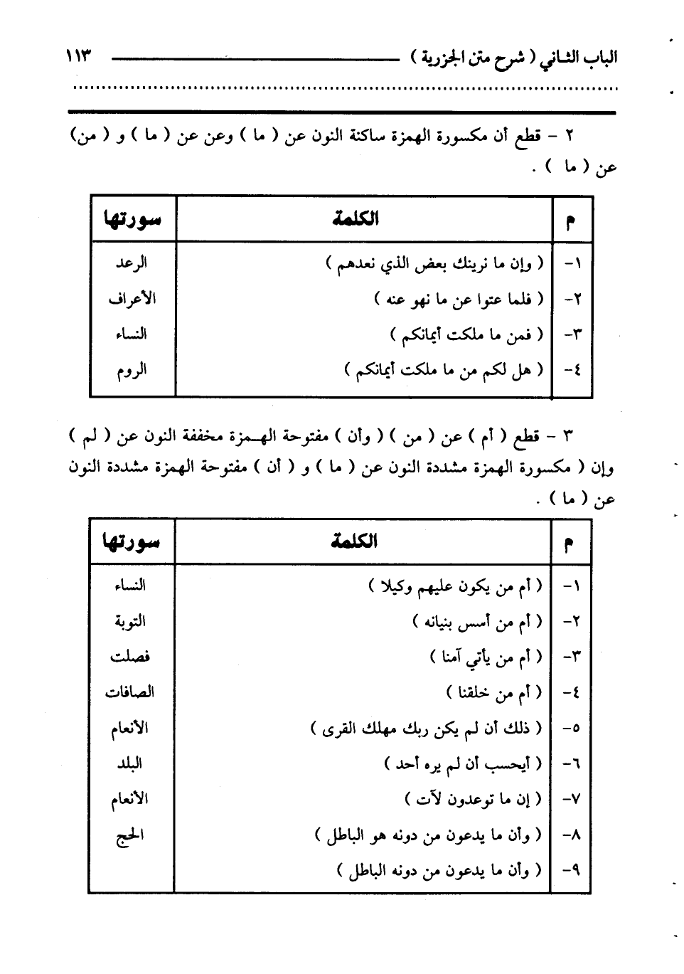 م/ الكلمة/ سورتها 1 - (وَإِنْ ما نُرِيَنَّكَ بَعْضَ الَّذِي نَعِدُهُمْ) / الرعد 2 - / (فلما عتوا عن ما نهوا عنه) / الأعراف 3 - / (فَمِنْ ما مَلَكَتْ أَيْمانُكُمْ) / النساء 4 - / (هَلْ لَكُمْ مِنْ ما مَلَكَتْ أَيْمانُكُمْ) / الروم 3 - قطع (أم) عن (من) (وأن) مفتوحة الهمزة مخففة النون عن (لم) وإن (مكسورة الهمزة مشددة النون عن (ما) و (أن) مفتوحة الهمزة مشددة النون عن (ما).