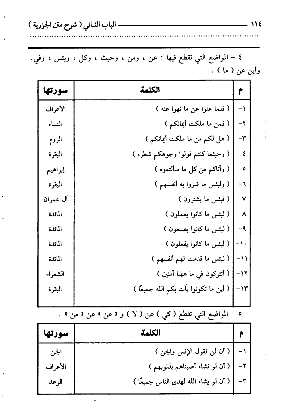 وأين عن (ما) م/ الكلمة/ سورتها 1 - / (فَلَمَّا عَتَوْا عَنْ ما نُهُوا عَنْهُ) / الأعراف 2 - / (فَمِنْ ما مَلَكَتْ أَيْمانُكُمْ) / النساء 3 - / (هَلْ لَكُمْ مِنْ ما مَلَكَتْ أَيْمانُكُمْ) / الروم 4 - / (وَحَيْثُ ما كُنْتُمْ فَوَلُّوا وُجُوهَكُمْ شَطْرَهُ) / البقرة 5 - / (وَآتاكُمْ مِنْ كُلِّ ما سَأَلْتُمُوهُ) / إبراهيم 6 - / (وَلَبِئْسَ ما شَرَوْا بِهِ أَنْفُسَهُمْ) / البقرة 7 - / (فَبِئْسَ ما يَشْتَرُونَ) / آل عمران 8 - / (لَبِئْسَ ما كانُوا يَعْمَلُونَ) / المائدة 9 - / (لَبِئْسَ ما كانُوا يَصْنَعُونَ) / المائدة 10 - / (لَبِئْسَ ما كانُوا يَفْعَلُونَ) / المائدة 11 - / (لَبِئْسَ ما قَدَّمَتْ لَهُمْ أَنْفُسُهُمْ) / المائدة 12 - / (أَتُتْرَكُونَ فِي ما هاهُنا آمِنِينَ) / الشعراء 13 - / (أين ما تكونوا يات بكم الله جميعا) / البقرة 5 - المواضع التي تقطع (كي) عن (لا) و «عن» عن «من».