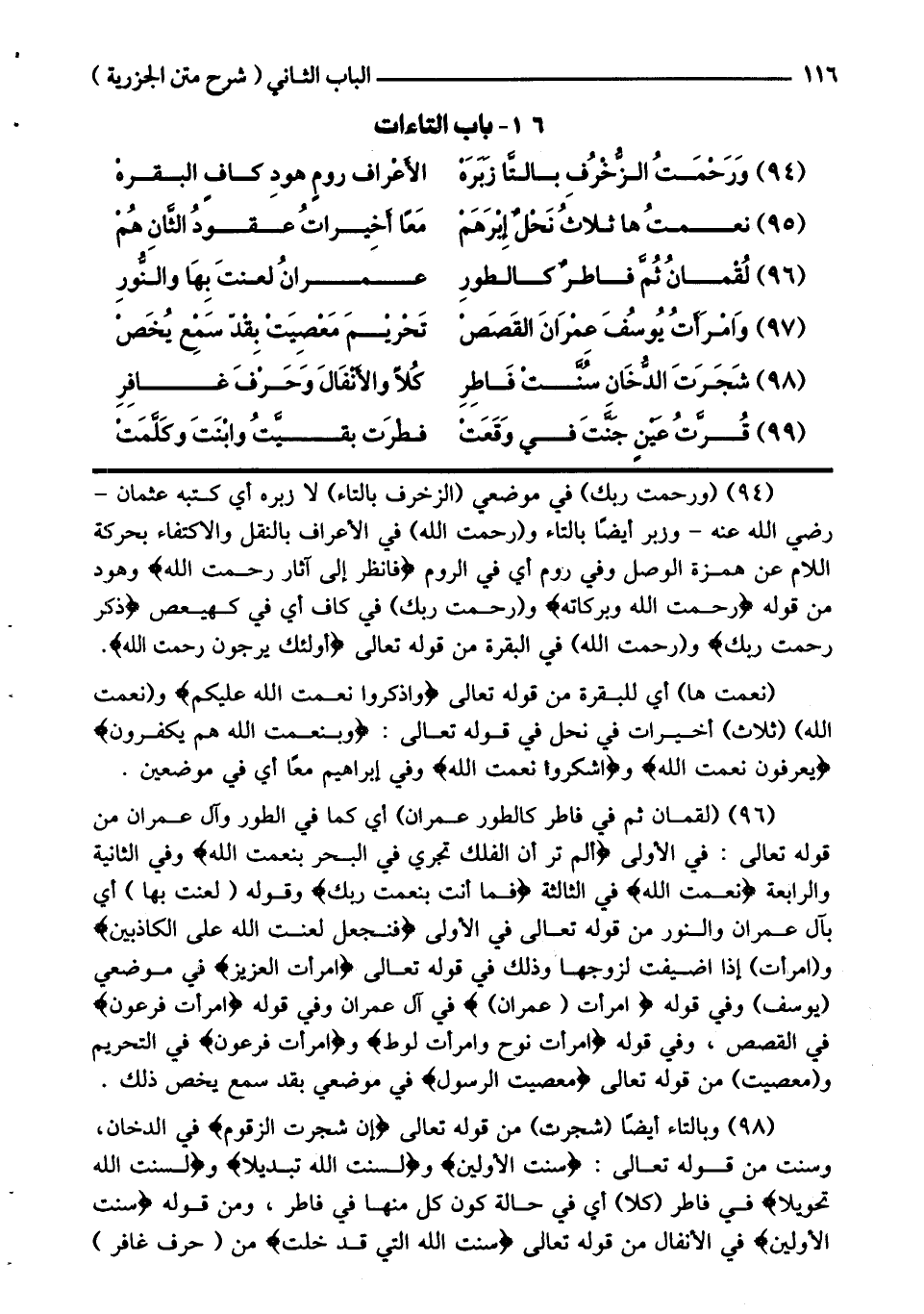 (94) (ورحمت ربك) في موضعي (الزخرف بالتاء) لا زبره أي كتبه عثمان - رضي الله عنه - وزبر أيضا بالتاء و (رحمت الله) في الأعراف بالنقل والاكتفاء بحركة اللام عن همزة الوصل وفي روم أي في الروم فَانْظُرْ إِلى آثارِ رَحْمَتِ اللَّهِ وهود من قوله رَحْمَتُ اللَّهِ وَبَرَكاتُهُ و (رحمت ربك) في كاف أي في كهيعص ذِكْرُ رَحْمَتِ رَبِّكَ و (رحمت الله) في البقرة من قوله تعالى أُولئِكَ يَرْجُونَ رَحْمَتَ اللَّهِ.