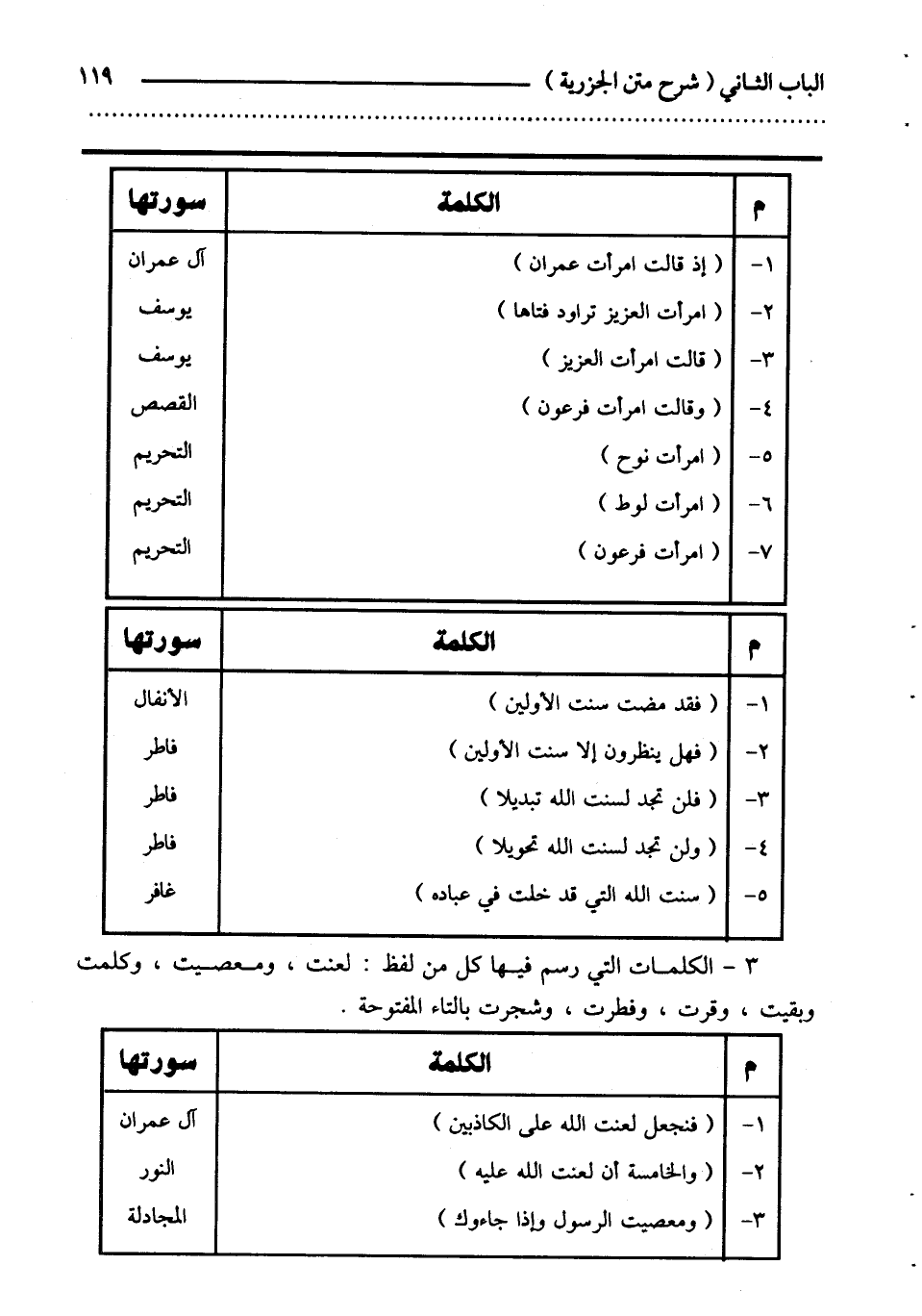 م/ الكلمة/ سورتها 1 - / (إِذْ قالَتِ امْرَأَتُ عِمْرانَ) / آل عمران 2 - / (امْرَأَتُ الْعَزِيزِ تُراوِدُ فَتاها) / يوسف 3 - / (قالت امرأت العزيز) / يوسف 4 - / (وَقالَتِ امْرَأَتُ فِرْعَوْنَ) / القصص 5 - / (امْرَأَتَ نُوحٍ) / التحريم 6 - / (امْرَأَتَ لُوطٍ) / التحريم 7 - / (امْرَأَتَ فِرْعَوْنَ) / التحريم م/ الكلمة/ سورتها 1 - / (فَقَدْ مَضَتْ سُنَّتُ الْأَوَّلِينَ) / الأنفال 2 - / (فَهَلْ يَنْظُرُونَ إِلَّا سُنَّتَ الْأَوَّلِينَ) / فاطر 3 - / (فَلَنْ تَجِدَ لِسُنَّتِ اللَّهِ تَبْدِيلًا) / فاطر 4 - / (وَلَنْ تَجِدَ لِسُنَّتِ اللَّهِ تَحْوِيلًا) / فاطر 5 - / (سُنَّتَ اللَّهِ الَّتِي قَدْ خَلَتْ فِي عِبادِهِ) / غافر 3 - الكلمات التي رسم فيها كل من لفظ: لعنت، ومعصيت، وكلمت وبقيت، وقرت، وفطرت، وشجرت بالتاء المفتوحة.
