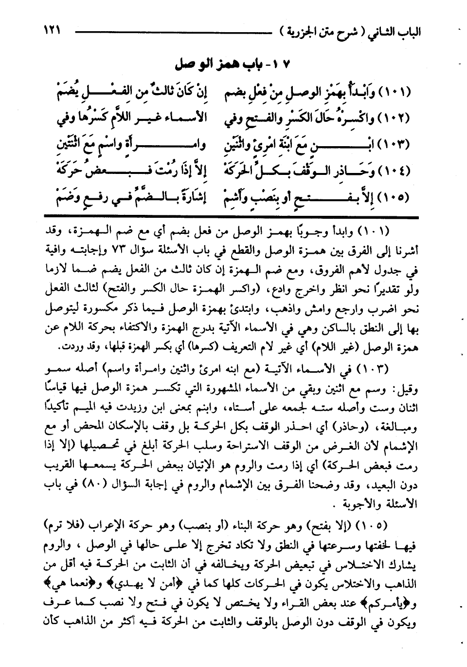 (101) وابدأ وجوبا بهمز الوصل من فعل بضم أي مع ضم الهمزة، وقد أشرنا إلى الفرق بين همزة الوصل والقطع في باب الأسئلة سؤال 73 وإجابته وافية في جدول لأهم الفروق، ومع ضم الهمزة إن كان ثالث من الفعل يضم ضما لازما ولو تقديرا نحو انظر واخرج وادع، (واكسر الهمزة حال الكسر والفتح) لثالث الفعل نحو اضرب وارجع وامش واذهب، وابتدئ بهمزة الوصل فيما ذكر مكسورة ليتوصل بها إلى النطق بالساكن وهي في الأسماء الآتية بدرج الهمزة والاكتفاء بحركة اللام عن همزة الوصل (غير اللام) أي غير لام التعريف (كسرها) أي بكسر الهمزة قبلها، وقد وردت.