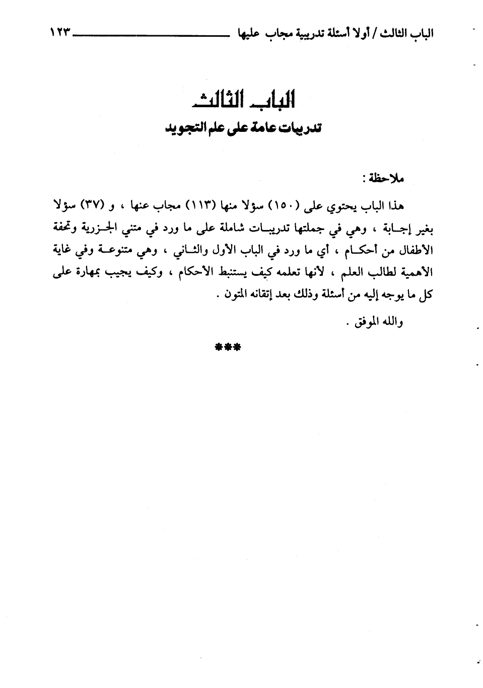 هذا الباب يحتوي على (150) سؤلا منها (113) مجاب عنها، و (37) سؤلا بغير إجابة، وهي في جملتها تدريبات شاملة على ما ورد في متني الجزرية وتحفة الأطفال من أحكام، أي ما ورد في الباب الأول والثاني، وهي متنوعة وفي غاية الأهمية لطالب العلم، لأنها تعلمه كيف يستنبط الأحكام، وكيف يجيب بمهارة على كل ما يوجه إليه من أسئلة وذلك بعد إتقانه المتون.