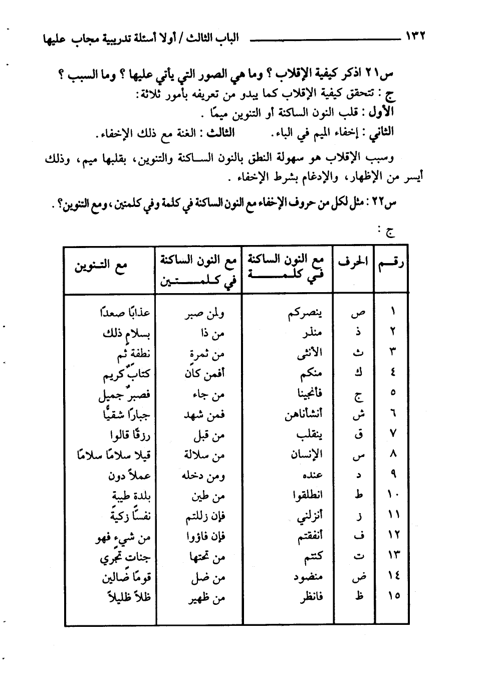 رقم/ الحرف/ مع النون الساكنة في كلمة/ مع النون الساكنة في كلمتين/ مع التنوين 1/ ص/ ينصركم/ ولمن صبر/ عذابا صعدا 2/ ذ/ منذر/ من ذا/ بسلام ذلك 3/ ث/ الأنثى/ من ثمرة/ نطفة ثم 4/ ك/ منكم/ أفمن كان/ كتاب كريم 5/ ج/ فأنجينا/ من جاء/ فصبر جميل 6/ ش/ أنشأناهن/ فمن شهد/ جبارا شقيّا 7/ ق/ ينقلب/ من قبل/ رزقا قالوا 8/ س/ الإنسان/ من سلالة/ قيلا سلاما سلاما 9/ د/ عنده/ ومن دخله/ عملا دون 10/ ط/ انطلقوا/ من طين/ بلدة طيبة 11/ ز/ أنزلني/ فإن زللتم/ نفسا زكية 12/ ف/ أنفقتم/ فإن فاءو/ من شيء فهو 13/ ت/ كنتم/ من تحتها/ جنات تجري 14/ ض/ منضود/ من ضل/ قوما ضالين 15/ ظ/ فانظر/ من ظهير/ ظلا ظليلا